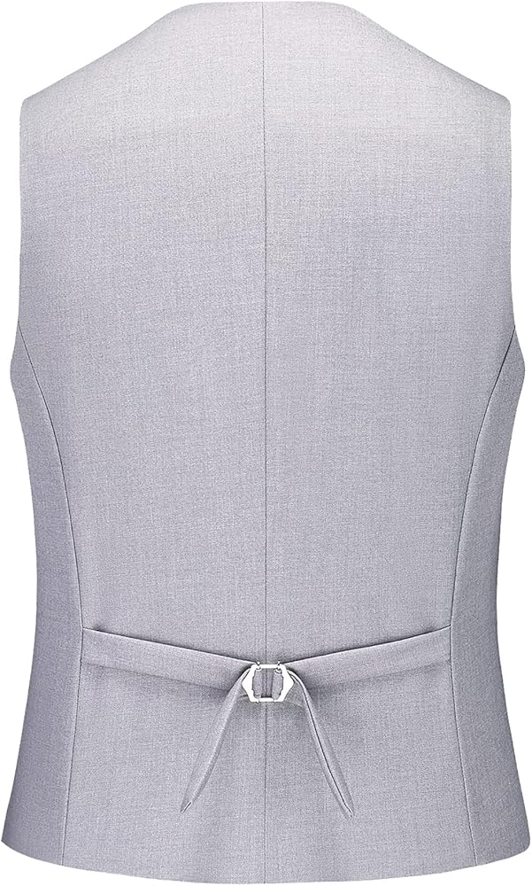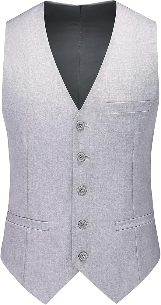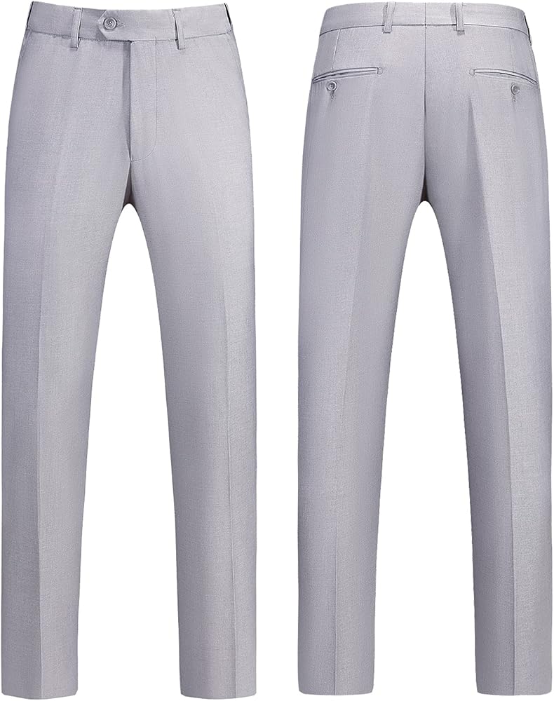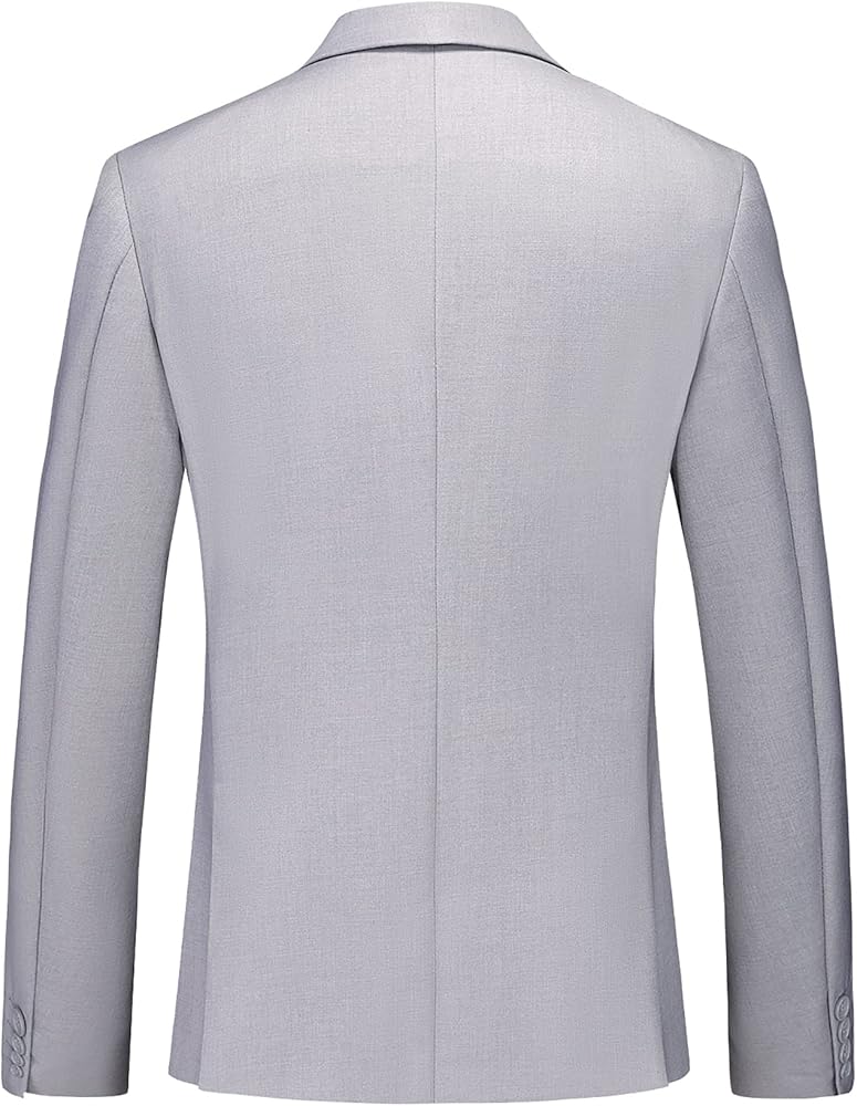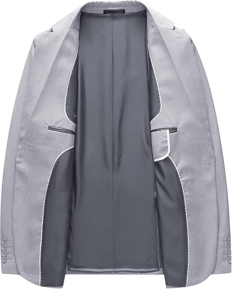 Mens slim fit suits with expandable waist, the elastic waist pants make it felt comfortable, One button side vent blazer jacket with true handkerchief pocket, 4 buttons peacked bottom vest with adjustable back