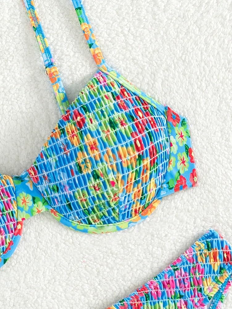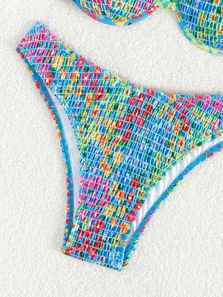 WDIRARA Women's 2 Piece Swimsuits String Triangle Floral Print Ruched Bathing Suits Smocked Cheeky Bikini Set