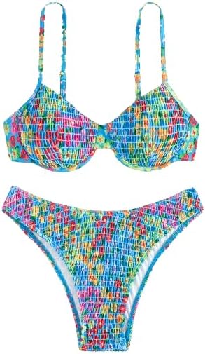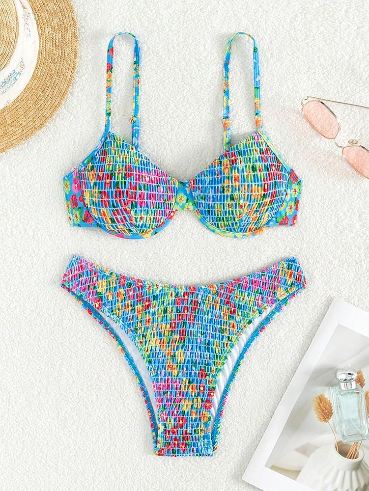 • Features: ruched, allover print, spaghetti strap, wireless bra, full coverage bottom, 2 piece bikini set