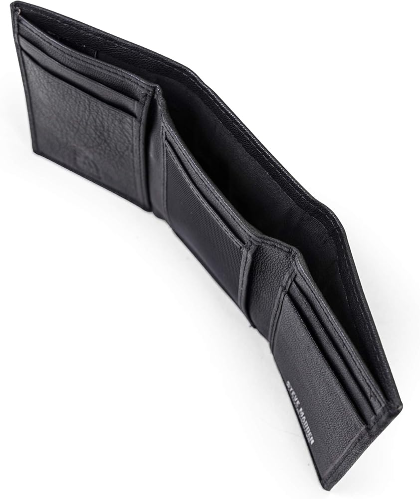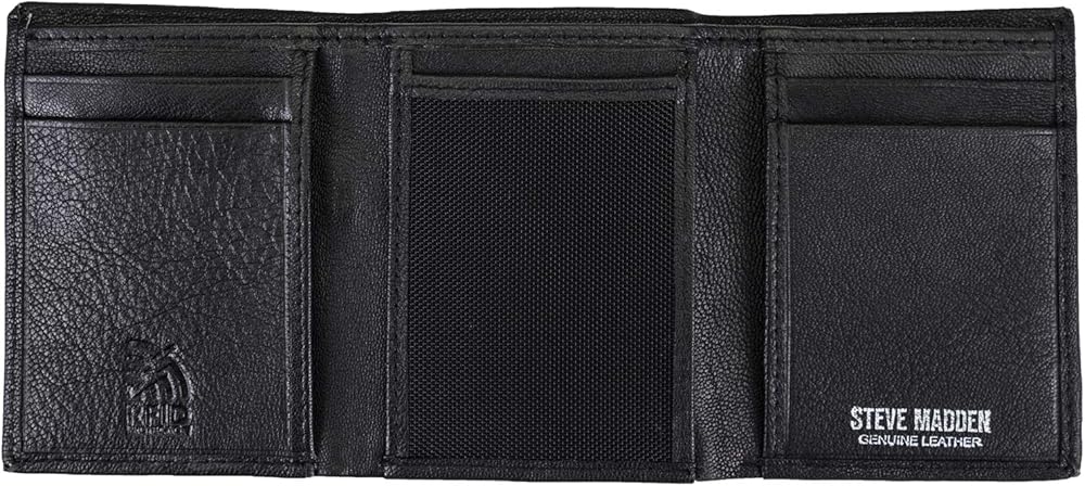 STEVE MADDEN GENUINE LEATHER RFID WALLET - A genuine leather slim compact trifold wallet with RFID technology, featuring 6 credit card slots, 3 additional pockets underneath the credit card slots, a clear ID slot, two cash pockets and an emBOSSed STEVE MADDEN logo.