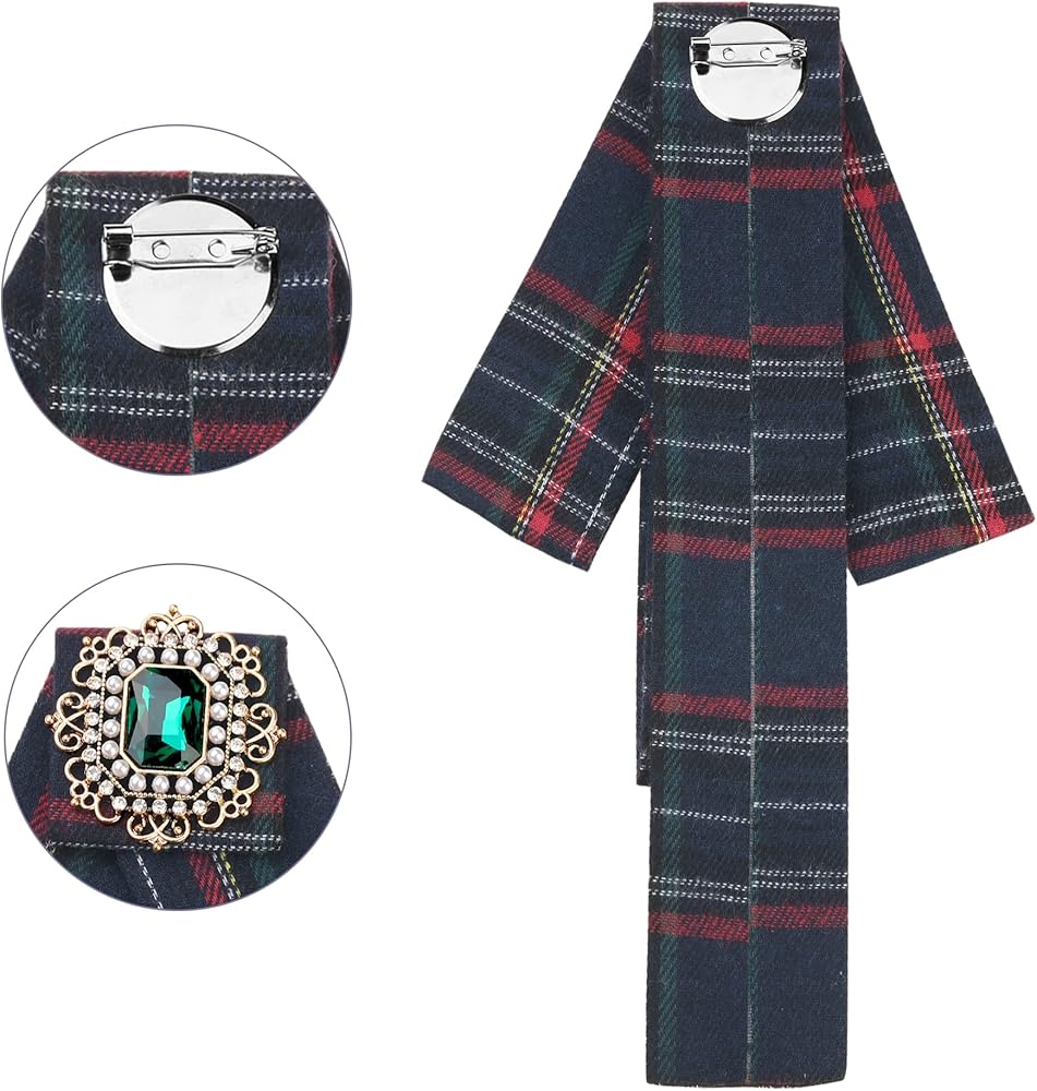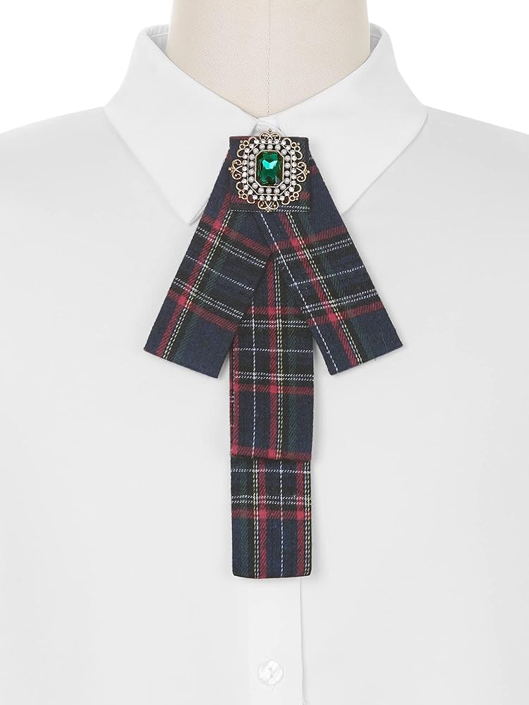 Women's Plaid Bow Brooch Tie Rhinestoneand Pearl Neck Tie Pin Checked Bow Tie
