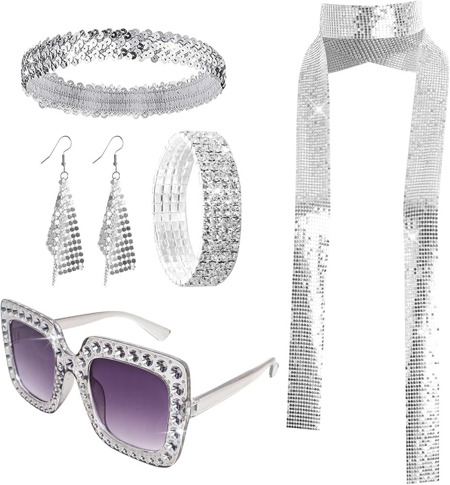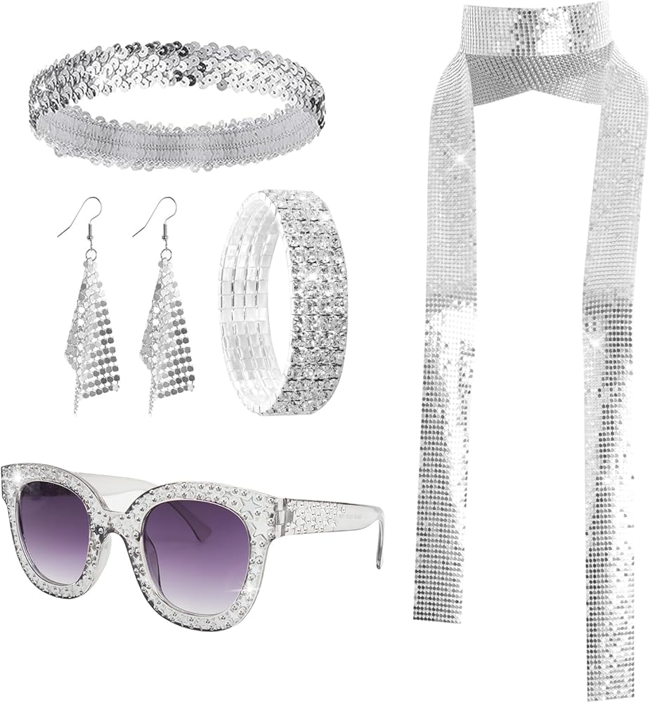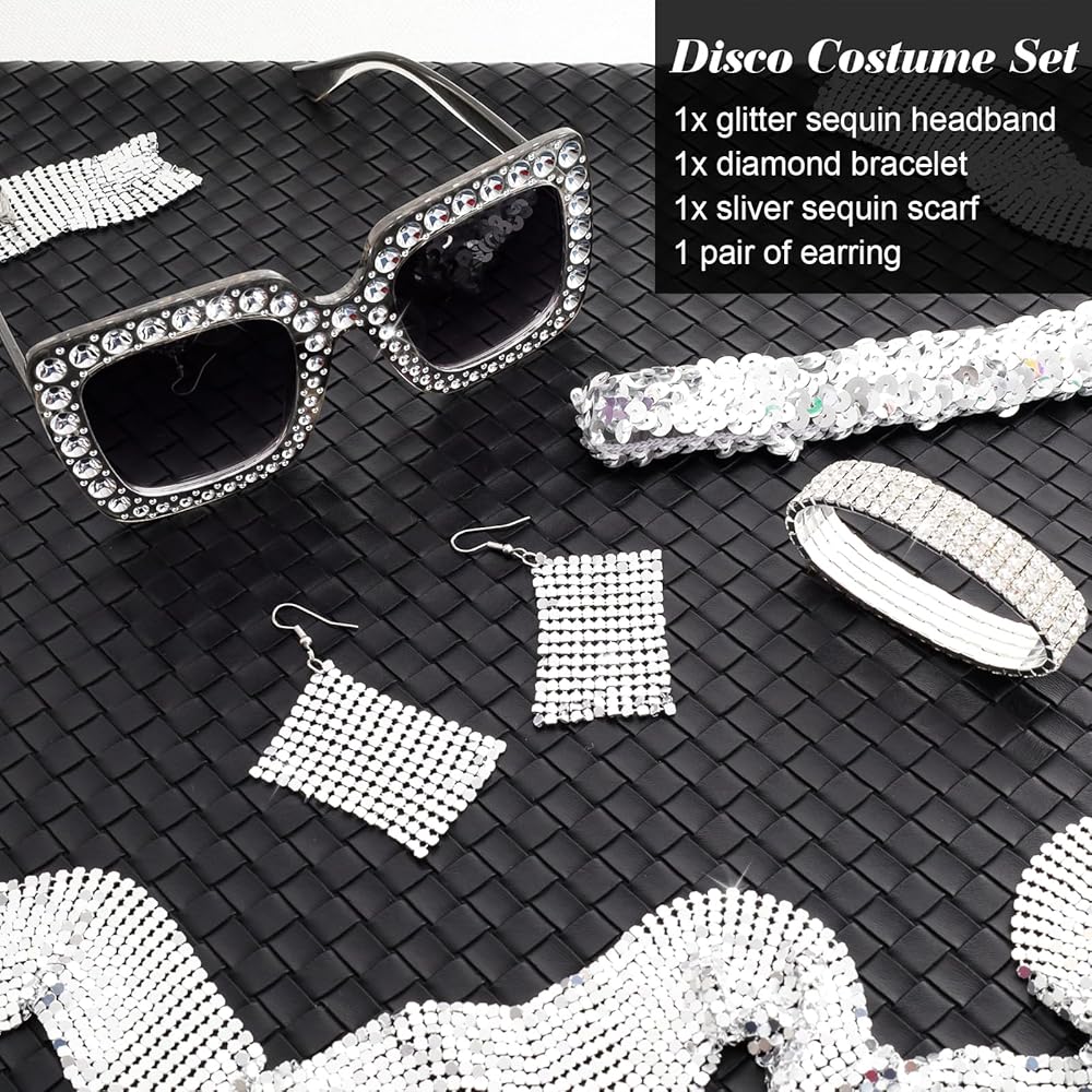 Disco Costume Set: You will receive a disco costume. These 70's disco costume is designed for most people. The sliver neck scarf is about 57 x 1.38 inches; disco bling earrings is about 3.2 inches; disco sunglasses is about 5.7 x 5.3 x 2.5 inches; disco glitter sequin headband and diamond bracelet are elastic and stretchy. The package contains 5 fabulous accessories from 1970s disco costumes, enough to complement your 70s disco outfit.