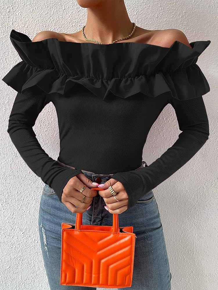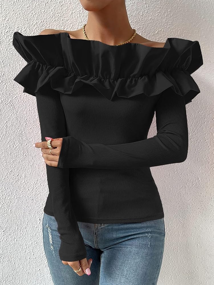 Unique design:: long sleeve, rib knit, off shoulder, exaggerated ruffle trim, slim fit, women long sleeve casual fashion shirt is good to pair with variety of jeans, skirts, pant