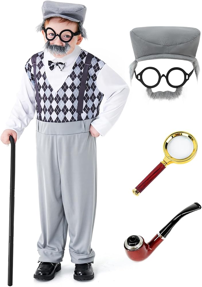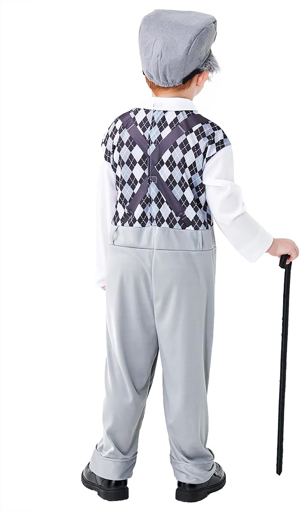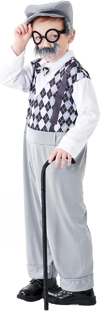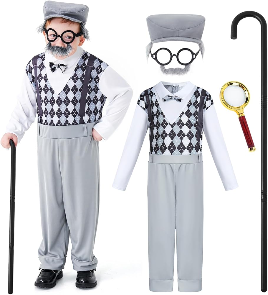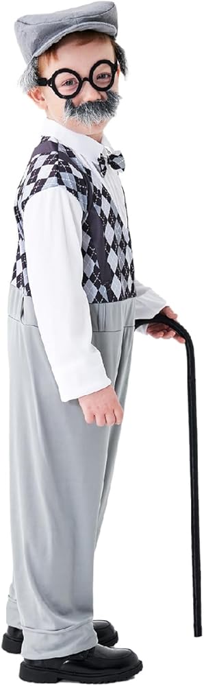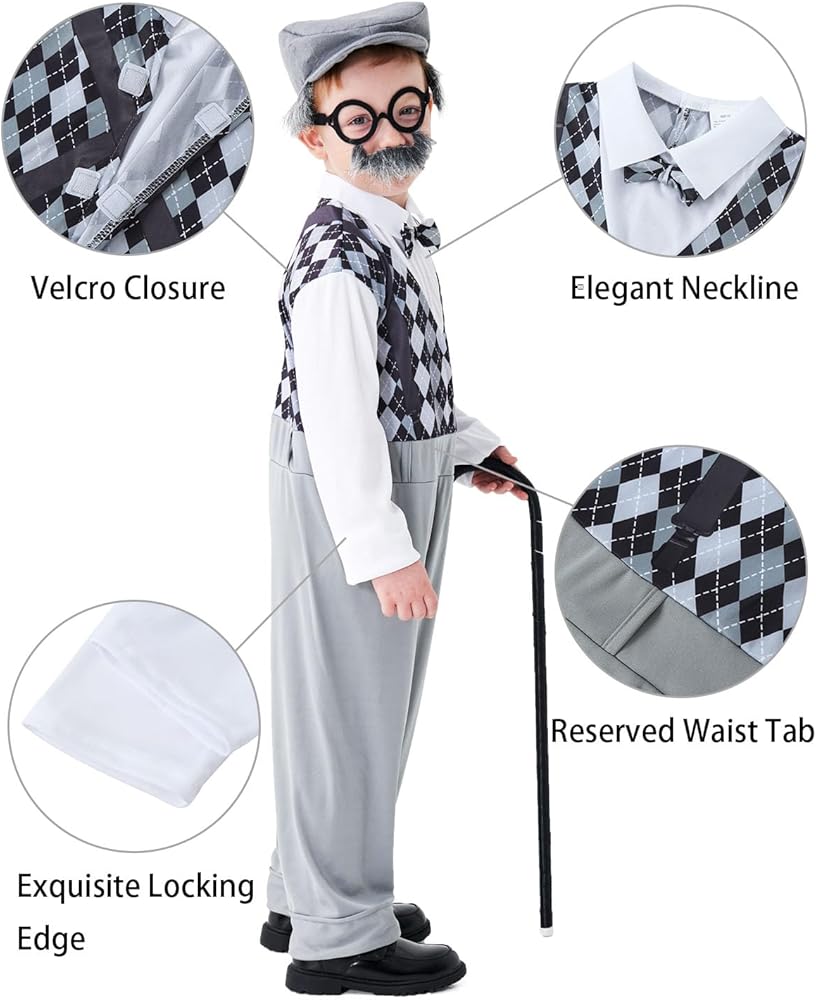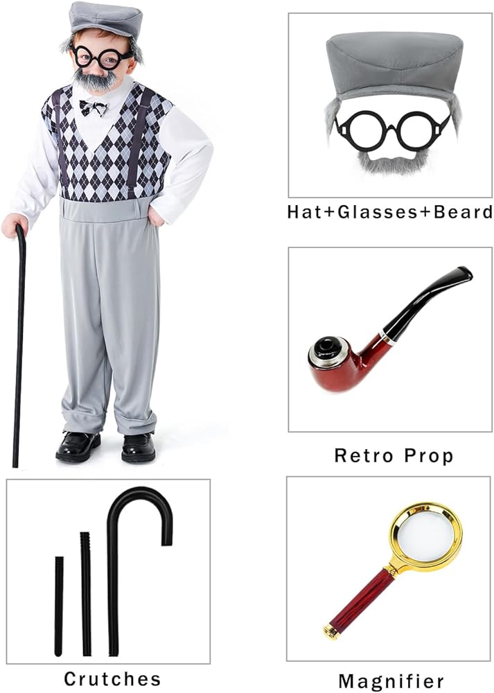 Old Man Costume for Kids Set: A complete set of grandpa costume, including 1 jumpsuit, 1 old man hat with glasses and fake mustache, 1 magnifier, 1 cane and 1 retro prop. You will receive everything necessary to complete grandpa costume outfit.