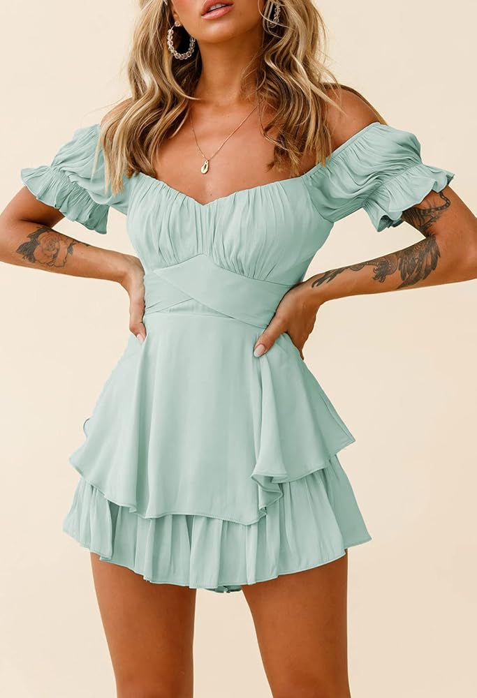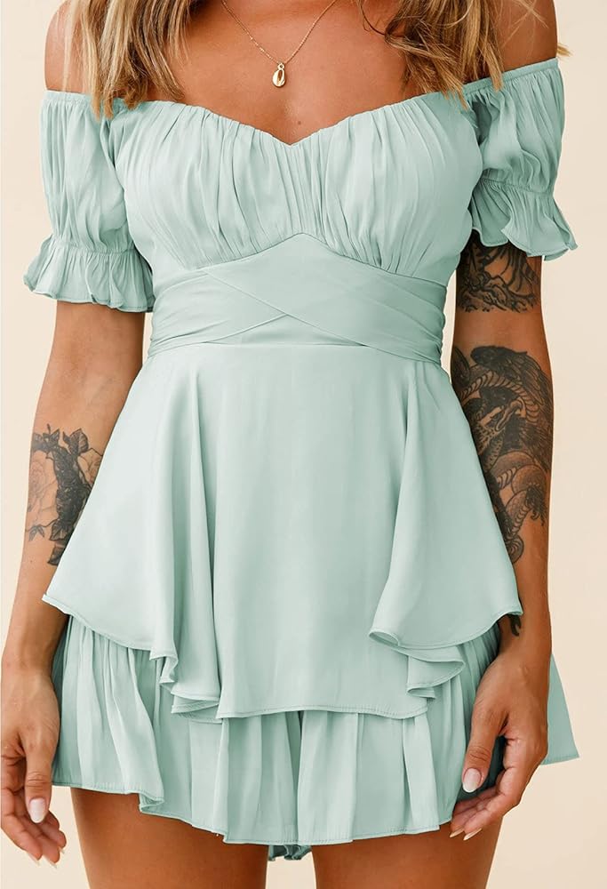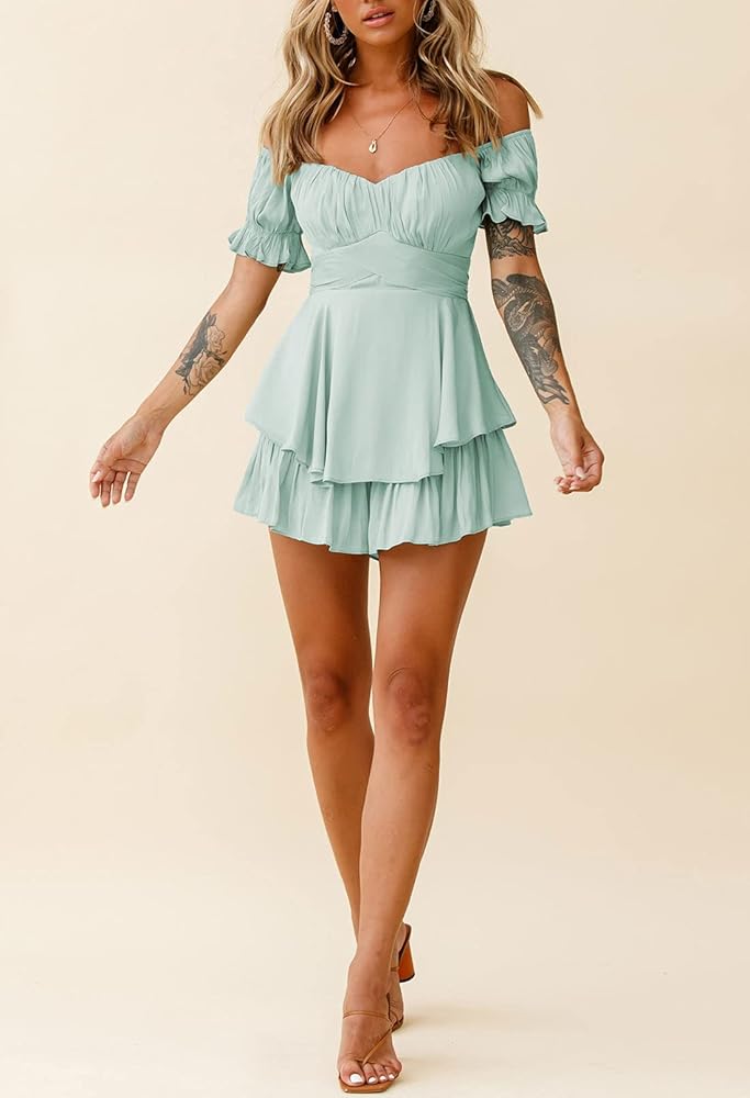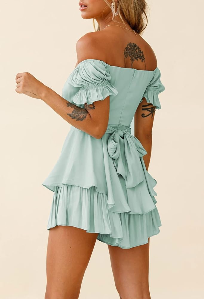 Features: Dressy-like ruffle rompers shorts for women, puff sleeve, off shoulder, strapless, short lantern ruffle sleeve, smocked bust, backless, zip up back closure, tie knot back, wide legs, high wasit and fashion double layer tiered ruffle hem.