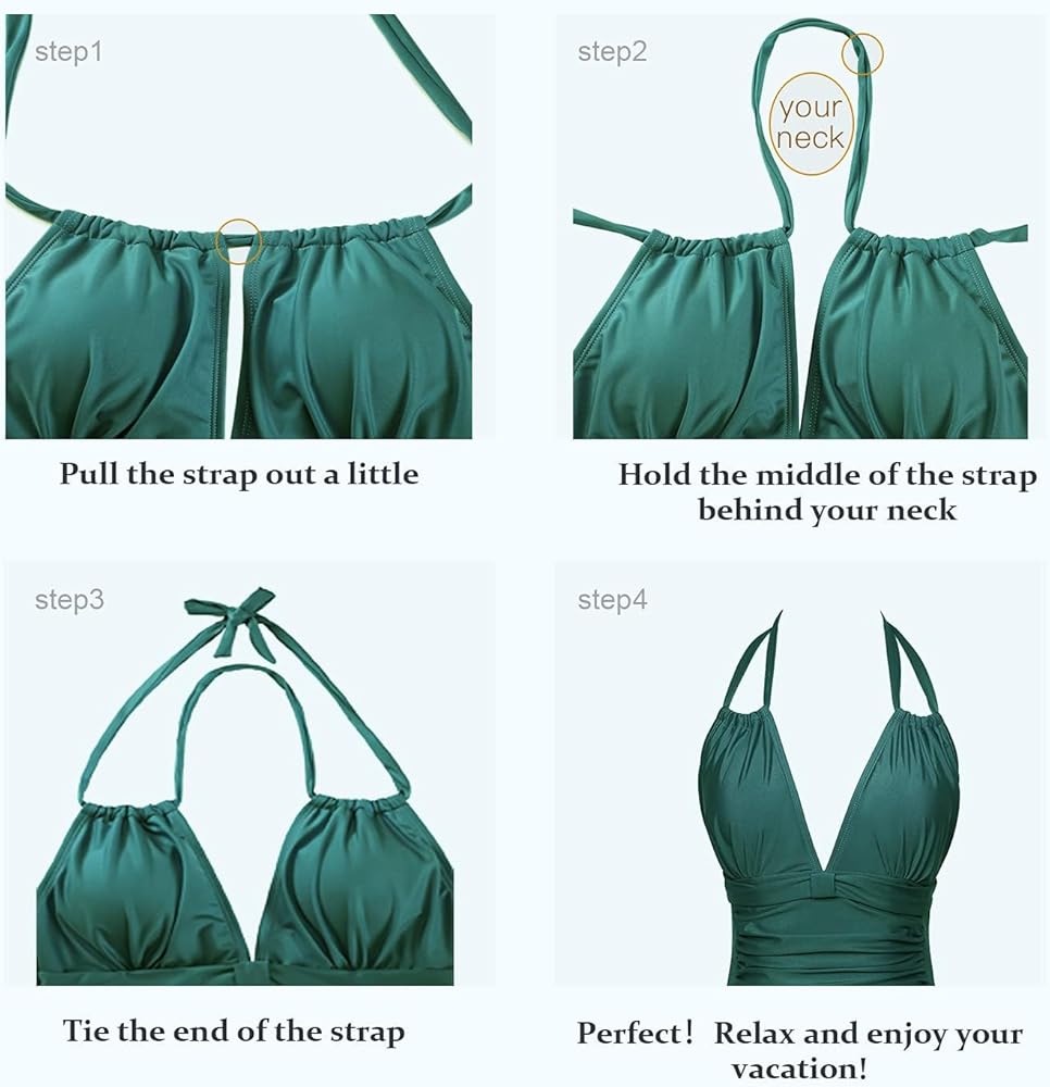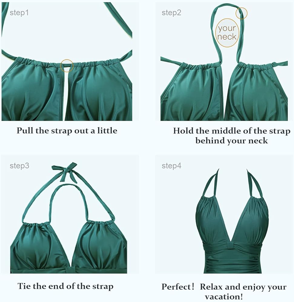Design : Our swimsuit can shift wearing style between sexy V Neck and modest keyhole in seconds. Halter One Piece Swimsuit with Ruched pattern in the torso accentuates your curves and hides imperfections while still being flattering.