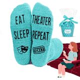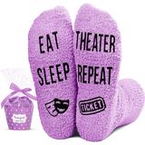 TERTER SOCKS: These dark pink socks are decorated with a tragicomic mask and tickets. Additionally, the socks are printed with the funny saying "EAT SLEEP THEATER REPEAT".