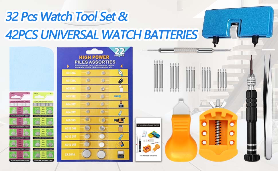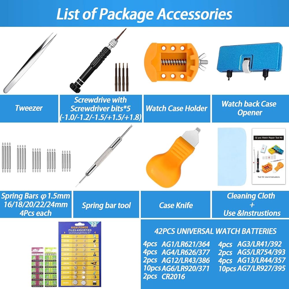 【MULTIFUNCTIONAL WATCH REPAIR TOOLS & KITS】GLDCAPA Watch Repair Kit contains 1pcs tweezers, 1pcs screwdrive with 5pcs spare head of the screwdriver (not magnetic), 1pcs case knife, 1pcs watch back case opener, 1pcs watch case holder, 1pcs spring bar tool, 20pcs spring bars (size:16/18/20/22/24mm,4pcs each), 2pcs cleaning cloth and 42pcs watch universal batteries, which solves most watch repair requirements like opening/closing watch backs, watch band replacement, changing watch batteries, watch cleaning& maintenance, replacing a watch crystal, etc.