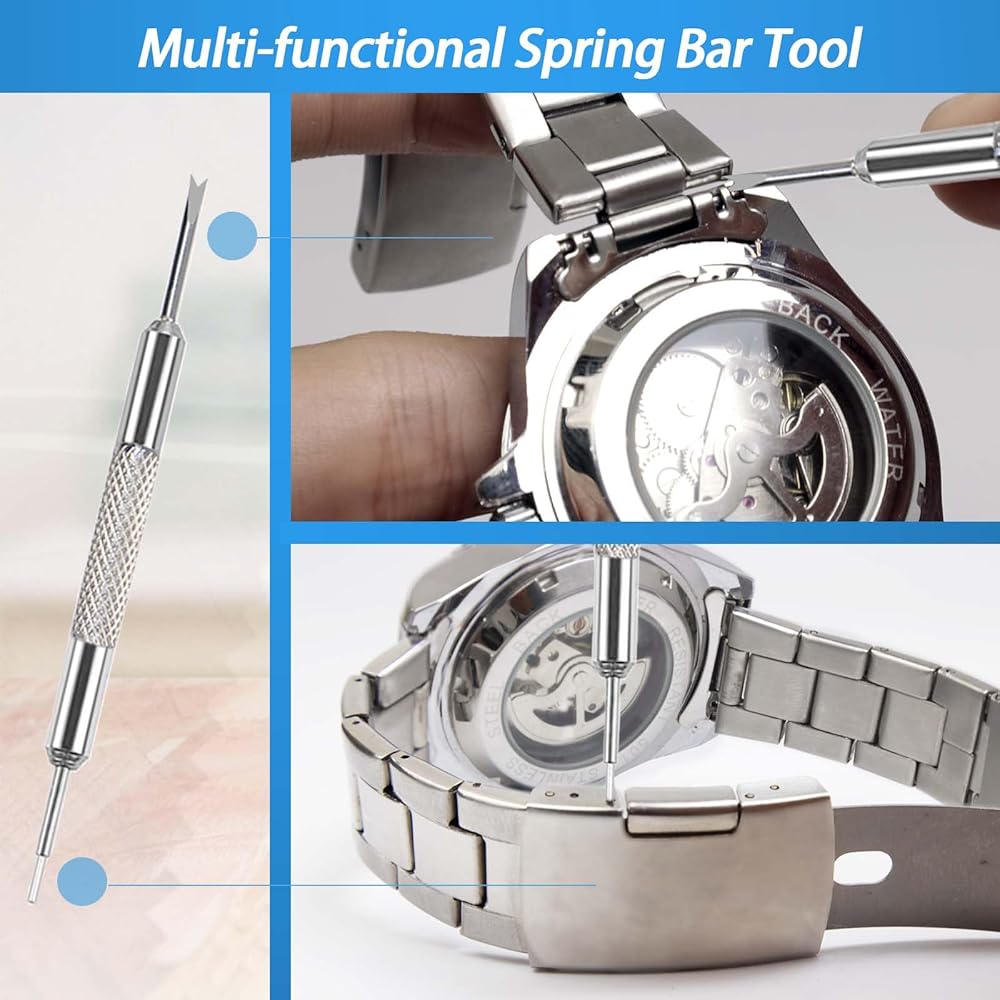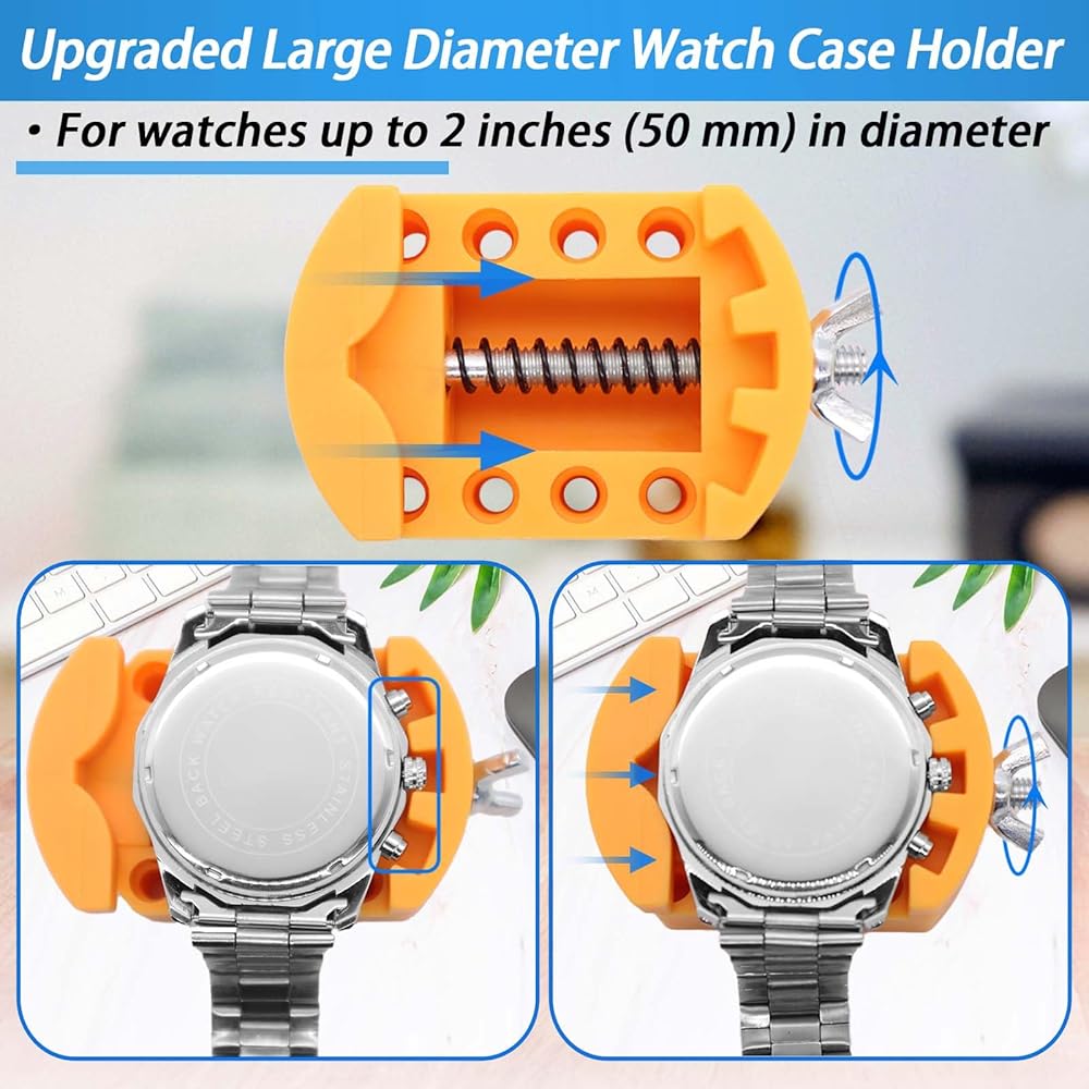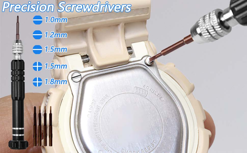 【SUITABLE FOR DIFFERENT TYPES OF WATCHES】Watch case knife is used for the watch case with a pry opening; Watch back case opener is used for watch cases with grooves, the watch back case opener can be used from 0.5-2.28inch(13-58mm), and the caliper spacing can be set by rolling the adjustment wheel to fit the grooves of your case; Screwdriver is used for watch case which is fixed by screws, the cover at the end of the screwdriver can be opened, the 5pcs spare head of the screwdriver is placed inside the screwdriver handle. Tweezers allow for easy battery removal.