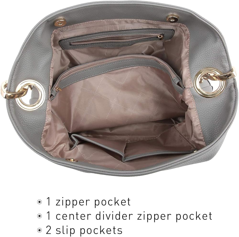 POCKETS: Outside: 1 backside zipper pocket; Inside: 1 back wall zip pocket, 1 center zip compartment, 2 open-top item pockets. Easy to organize your everyday items.