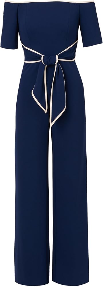 Modern and sleek, our iconic jumpsuit is crafted from a luxe stretch knit crepe and features a feminine off-the-shoulder neckline and a dramatic self-tie belt with piped detail. Details we love: the modern elbow sleeves and wide-leg pants. A flattering style to wear here, there and everywhere.