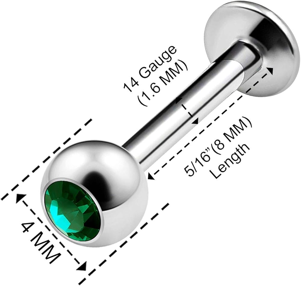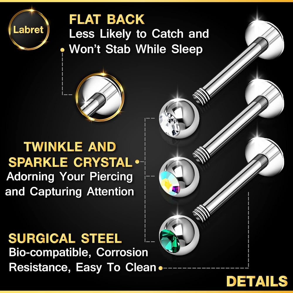 YOU WILL GET Three pieces 14g 1.6mm Steel labret jewerly 4mm ball. There are 4 Lights 6mm 8mm 10mm 12mm and 6 color sets for your choice. They are safely store in satin pouch or jewelry box.