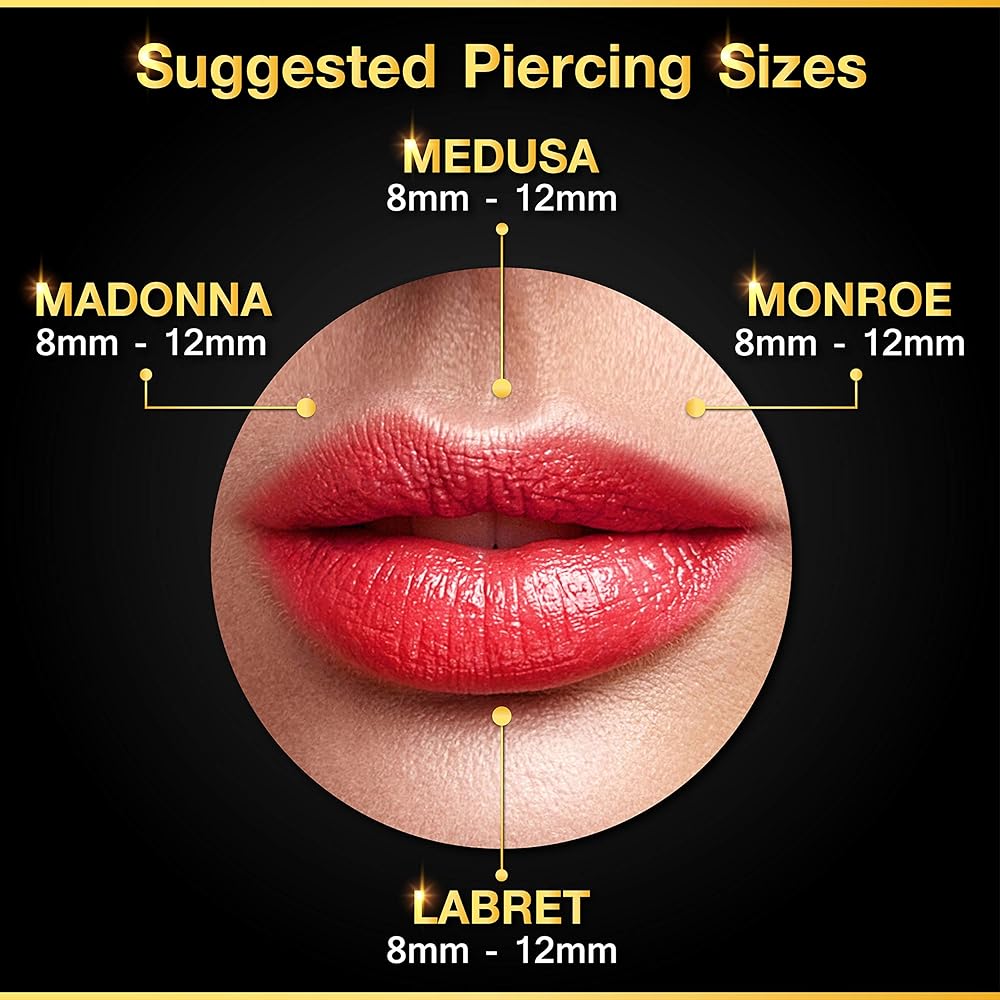 UNIFORM SIZING means these snake bites lip rings can be worn in a variety of piercings; Auricle, Cartilage, Helix, Lip, Lobe, Medusa, Pinna, Rim, Snake Bites, Spider Bites, Monroe, Labret, Tragus and many more.