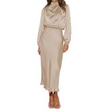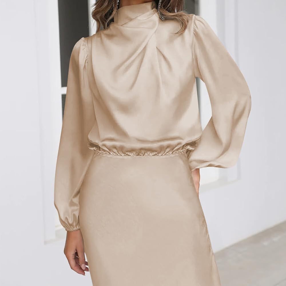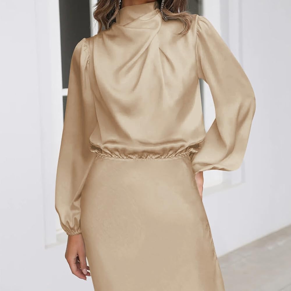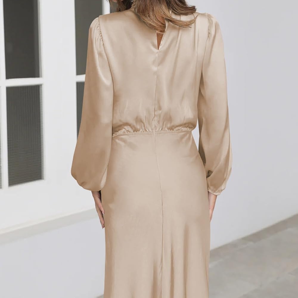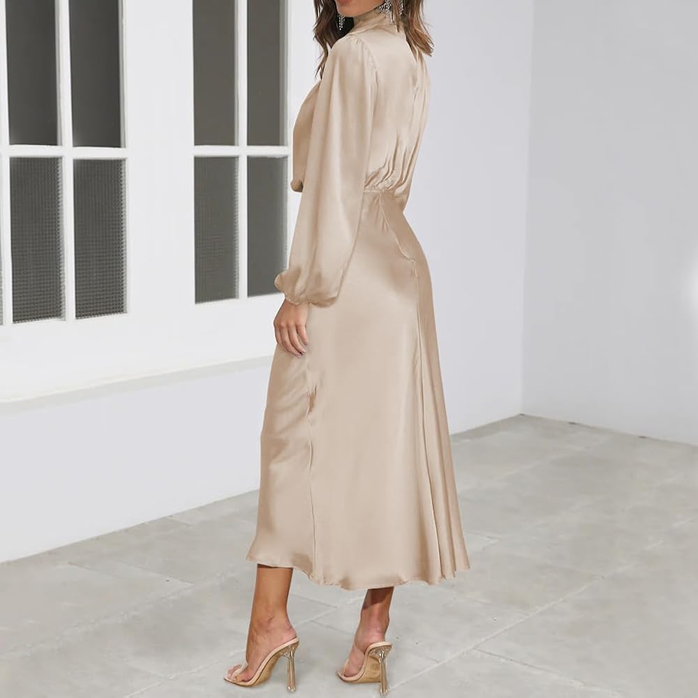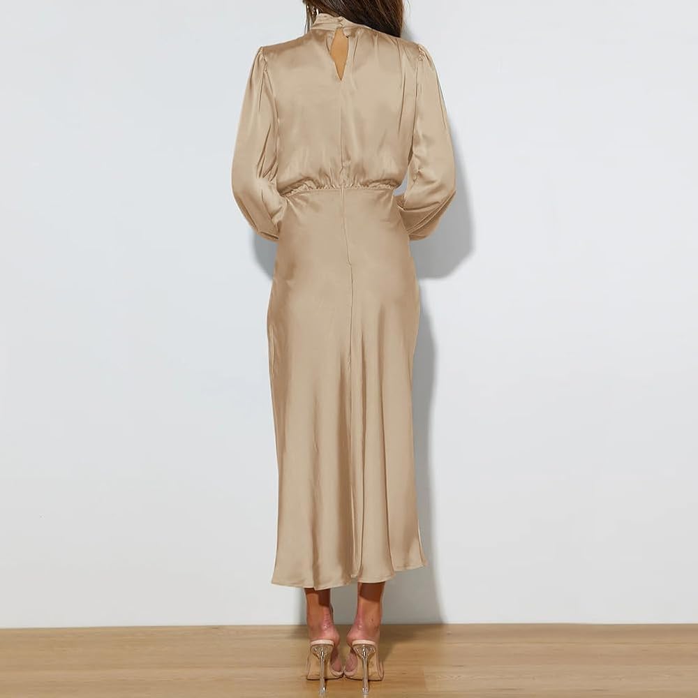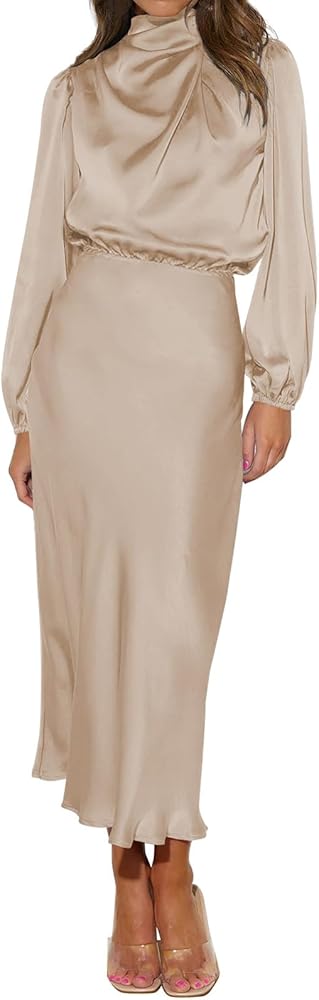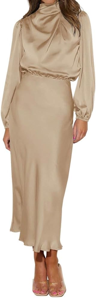 Mock Neck Maxi Dress: Long sleeve satin dress for women is mock neck and designed with ruched detail at the front chest, really special and super elegant; the elastic high waist can perfectly show your body proportions, adding chic and elegance.