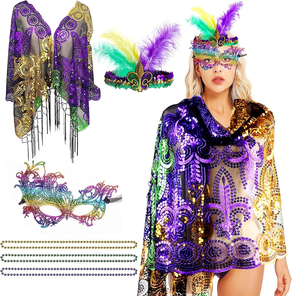 Edussy Mardi Gras Outfit Set - Mardi Gras Classic Costumes including Headband, Shawl, Mask, and Beaded Necklace Accessories for Women