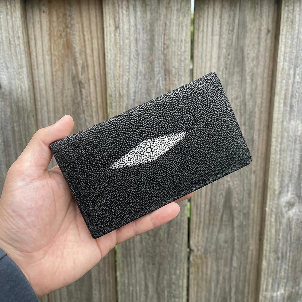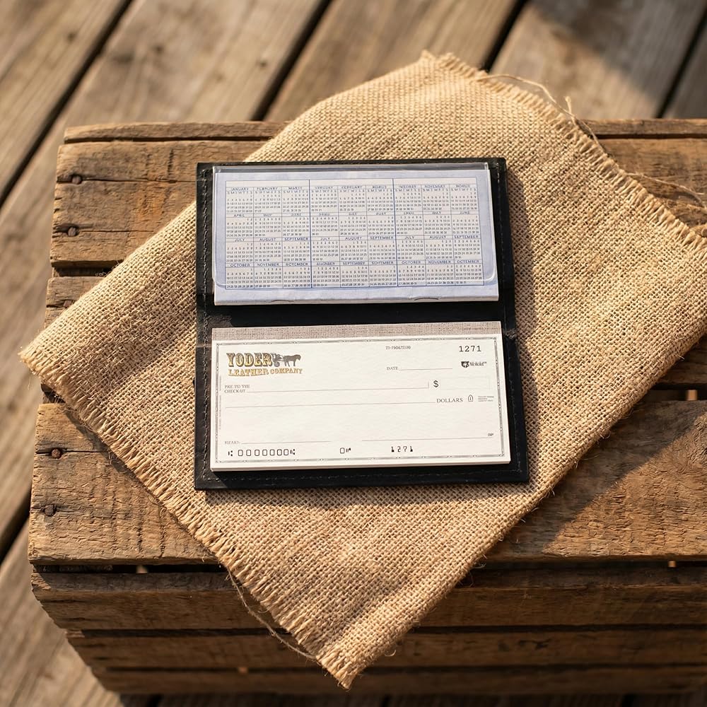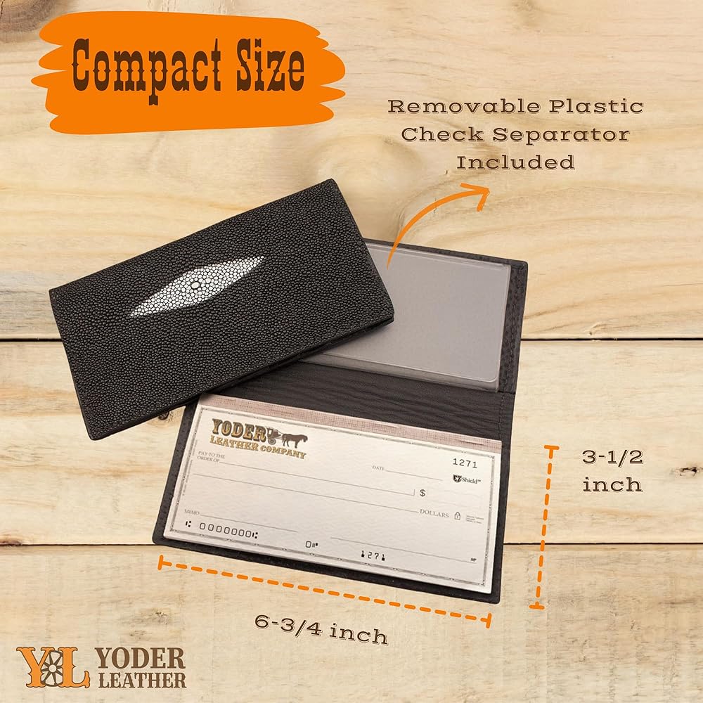 This checkbook is made with beautiful genuine Stingray Skin Leather. It is stitched with heavy duty nylon thread that matches the color of the leather. Every Yoder Leather Company product is hand crafted in our Amish workshop. Stingray has a natural coating that makes it highly fire resistant.