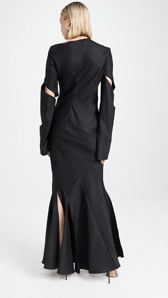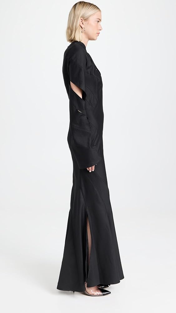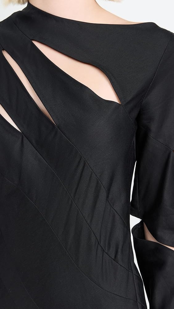 - Bias cut for slight stretch and an elegant drape, Cut out details at chest and sleeves, Round neckline and long bell sleeves, Tassel hem line