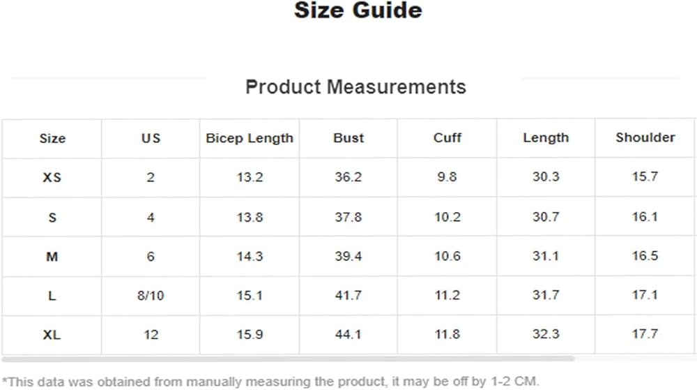 X-Small: US: 2.0", Bicep Length: 13.2", Bust: 36.2", Cuff: 9.8", Length: 30.3", Shoulder: 15.7", Sleeve Length: 23.6", Waist Size: 30.7"