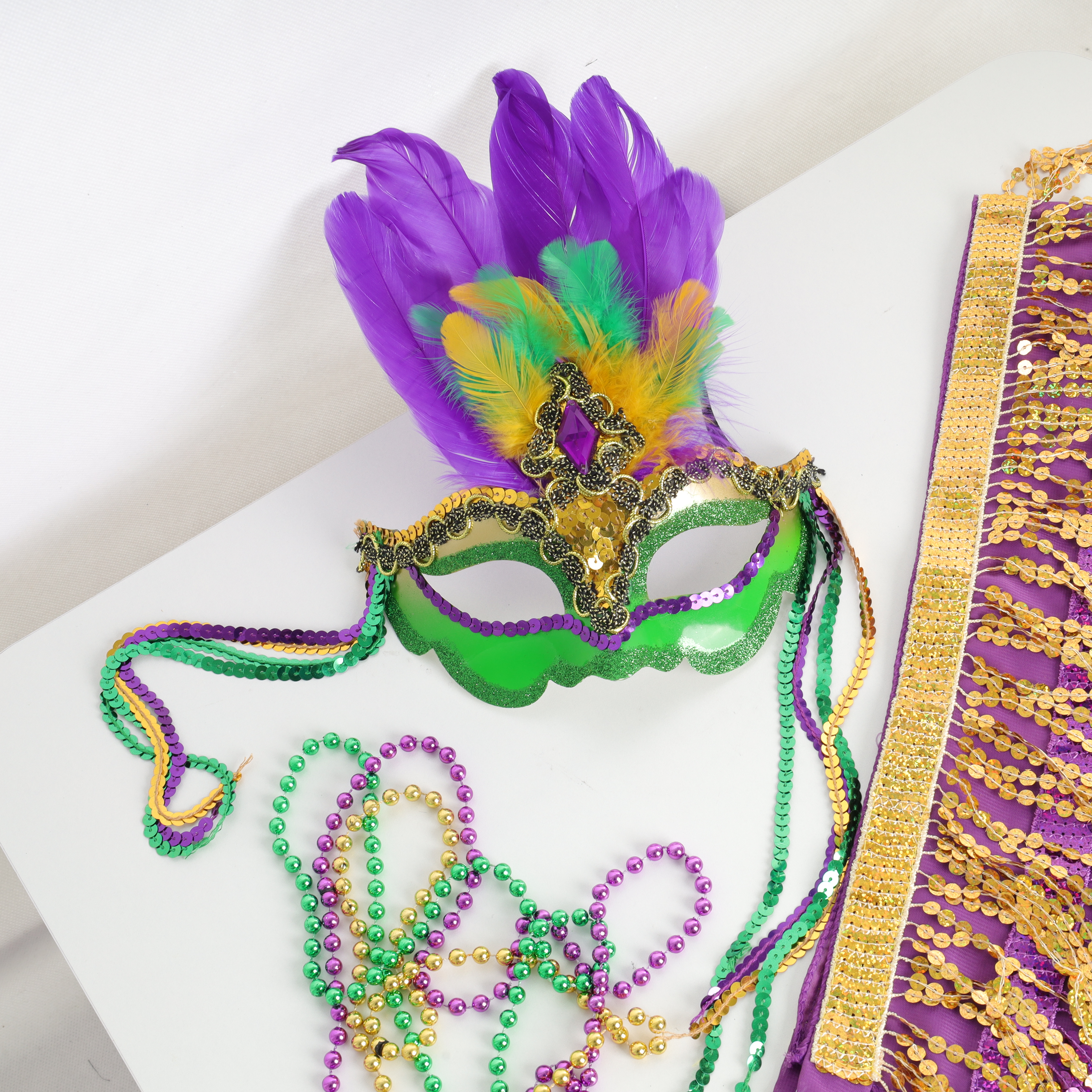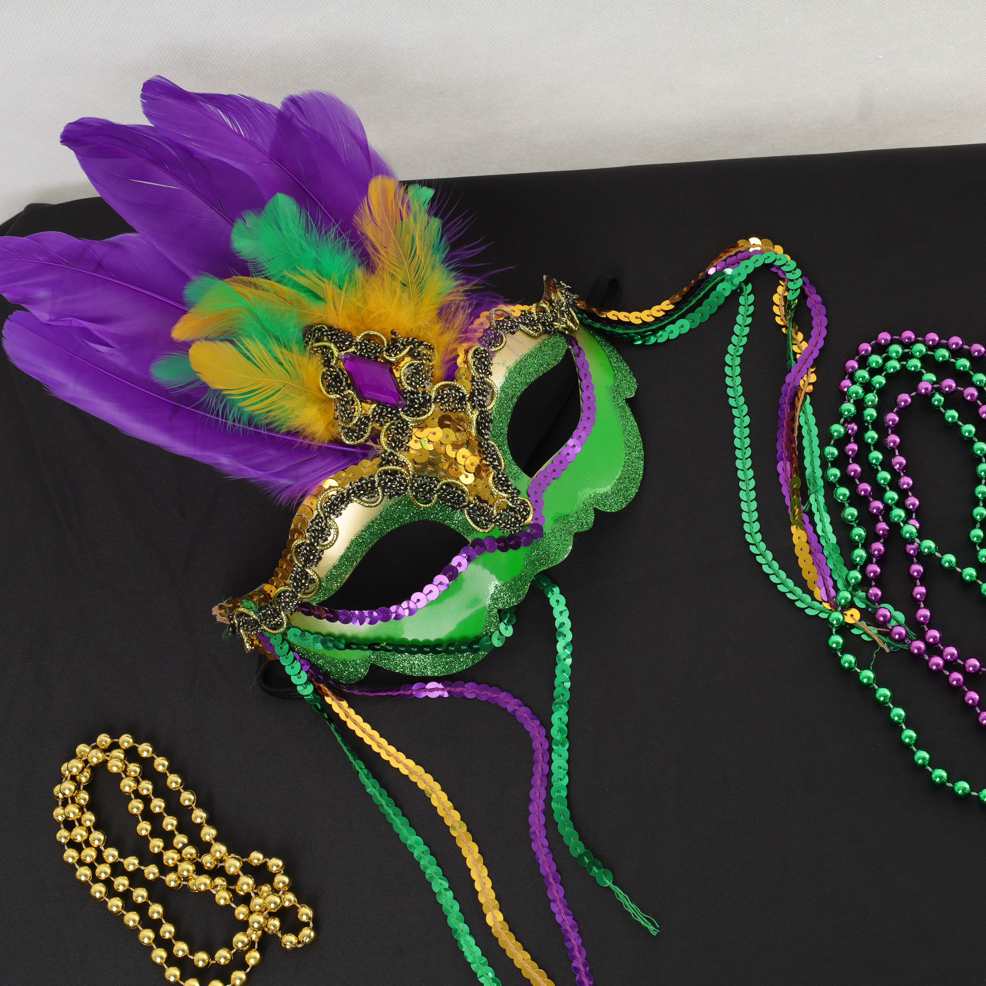 Mardi Gras Theme Design: The Mardi Gras feather mask is featured with 3 traditional colors, gold, green and purple, which representing power, faith and justice. Whole mask covered with shiny sequins and decorated with sequin tassels, vivid color and fashionable appearance