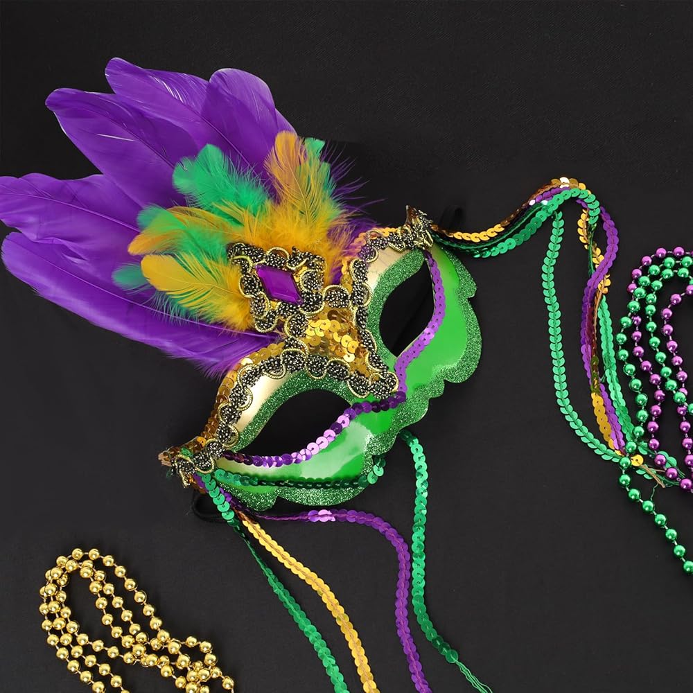 Savgkoyt Mardi Gras Mask for Women Adults, Carnival Face Masks with Feathers, Sequin Gold Purple Green Decorations Color for Masquerade Halloween Cosplay Party