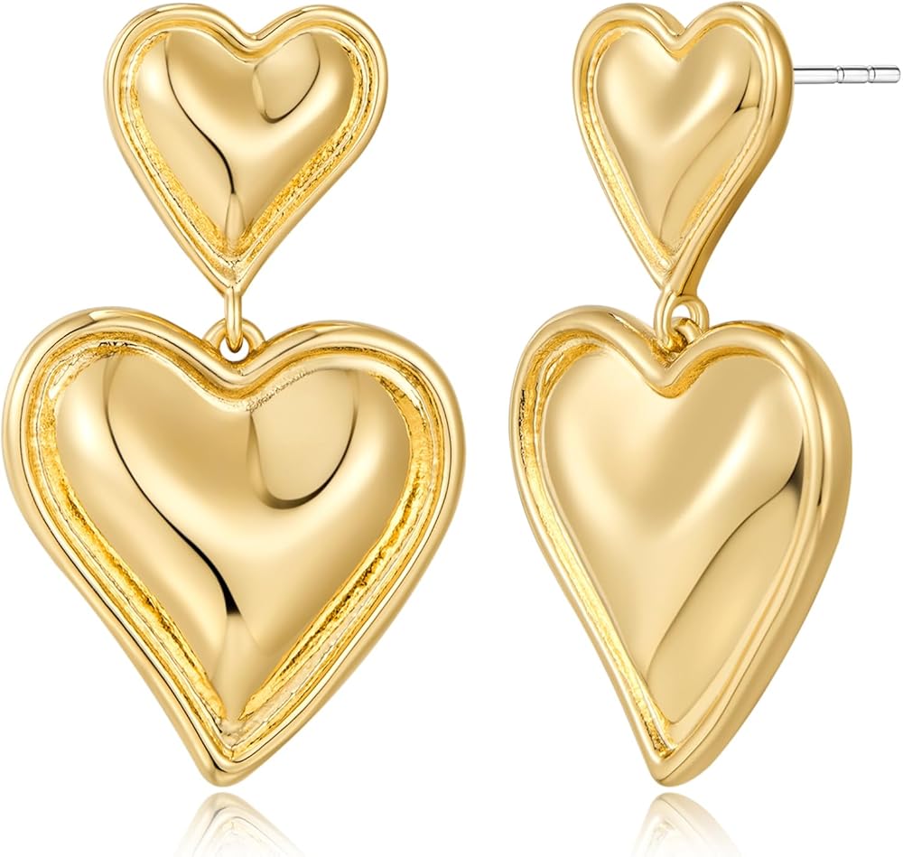 WOWORAMA Gold Heart Earrings for Women Vintage Love Heart Dangle Earrings Double Heart Drop Earings Matte Gold Statement Earrings Jewelry Gift for Valentines Day Mother's Day Birthday gifts