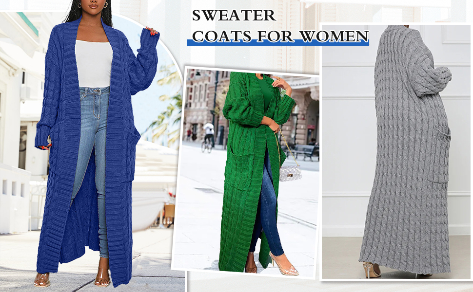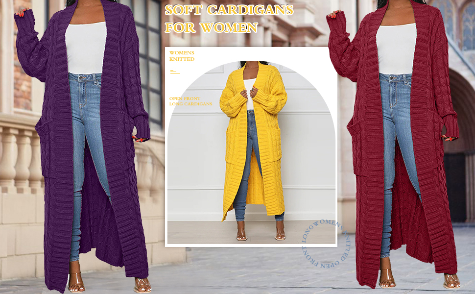 التصميم - كارديجان مفتوح من الأمام بلون سادة مع جيبين جانبيين، سويتر بنمط ماكسي طويل محبوك ملفوف، معطف ناعم ودافئ، سترة كارديجان مكتنزة فضفاضة.