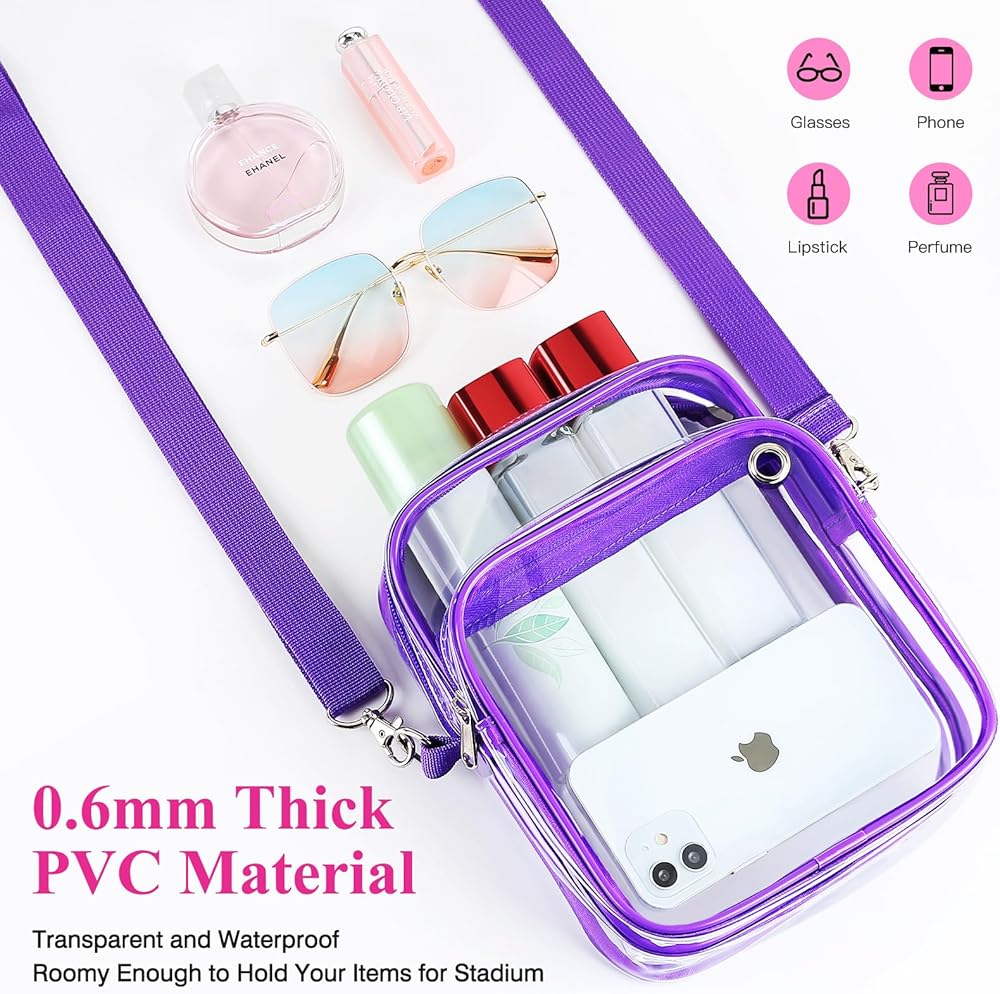 TRANSPARENT CROSSBODY BAG - Made of PVC material, thicker, anti-yellow stain and water-resistant, with reinforced stitching and SBS zippers. Feature with triple pockets to allocate space for must-have item to get hands-free!