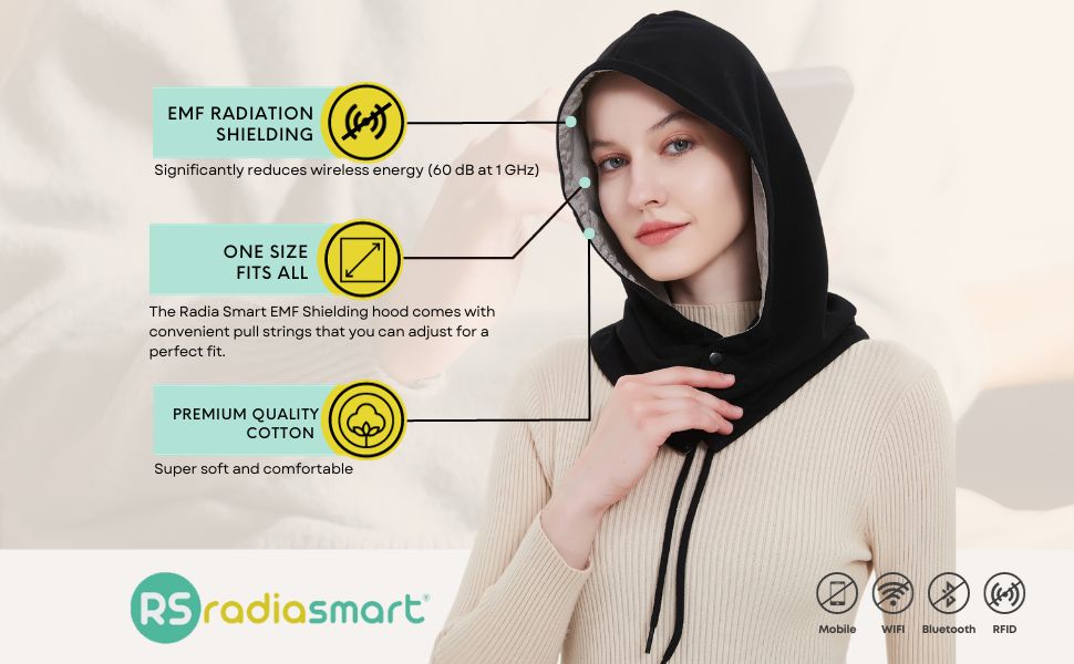 🌱 COVERS AND PROTECTS YOUR HEAD AND NECK. The Radia Smart shielding hood is designed with care to keep your head, neck, and thyroid safe from the radiofrequency (RF) and microwave wireless radiation that surrounds us. It's like a cozy shield against WIFI routers, cell towers, cordless phones, Bluetooth, and more. So, whether you're at home, in the office, or on the move, our hood's got your head covered. Stay protected and enjoy peace of mind wherever you are!