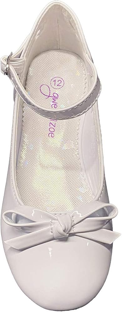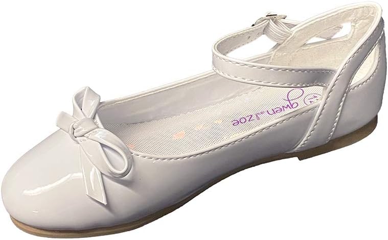 Your daughter will love these Gwen & Zoe flower girl dress shoes for weddings and parties. They come in big and little girl sizes and are flats with a strap. She will be able to wear these girls flats all day with the cushioned insole and round closed toe design. These little girl dress shoes are made to be easy to wear with adjustable ankle straps and stretch band. Wear them for a variety of occasions including Princess Dress Up, Pageants, Easter, Christmas, Communion, Confirmations, any wedding, her birthday party, dances, father-daughter dances, tea parties, formals, semi formals, special occasions, jr bridesmaids, flower girl and holiday parties. These ballet flats come in white and pink patent and also ivory and silver matte. These shoes come in size 9,10,11,12,13,1,2,3,4,5. Zapatos de vestir para niñas. Zapatos de vestir planos para niñas. Blanco, plata, rosado, beige.
