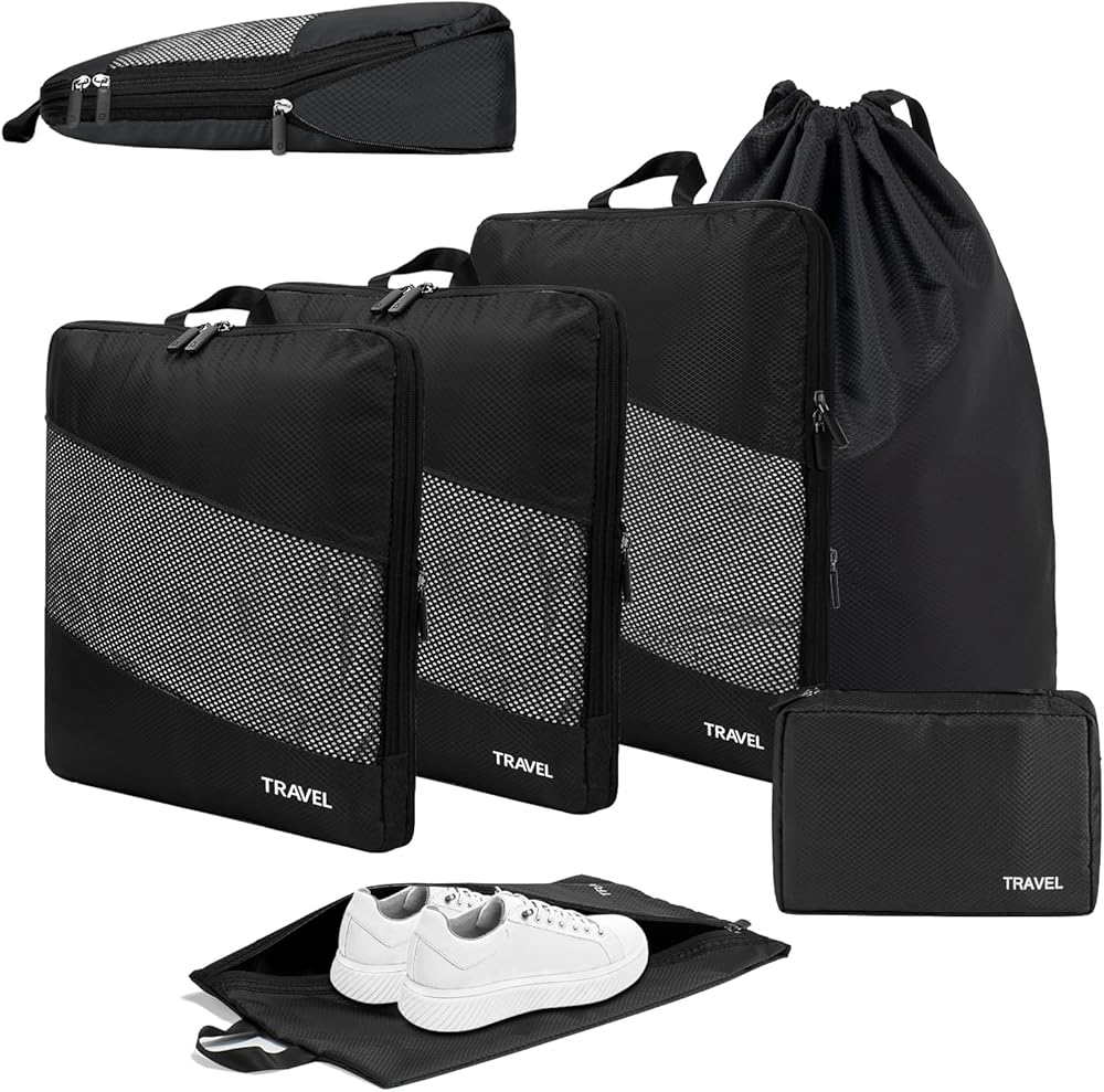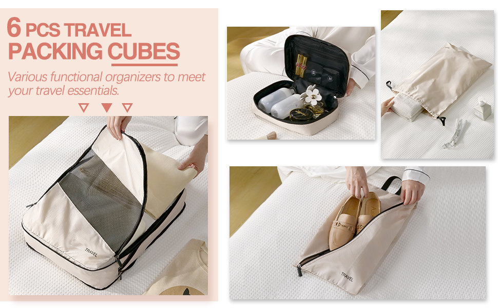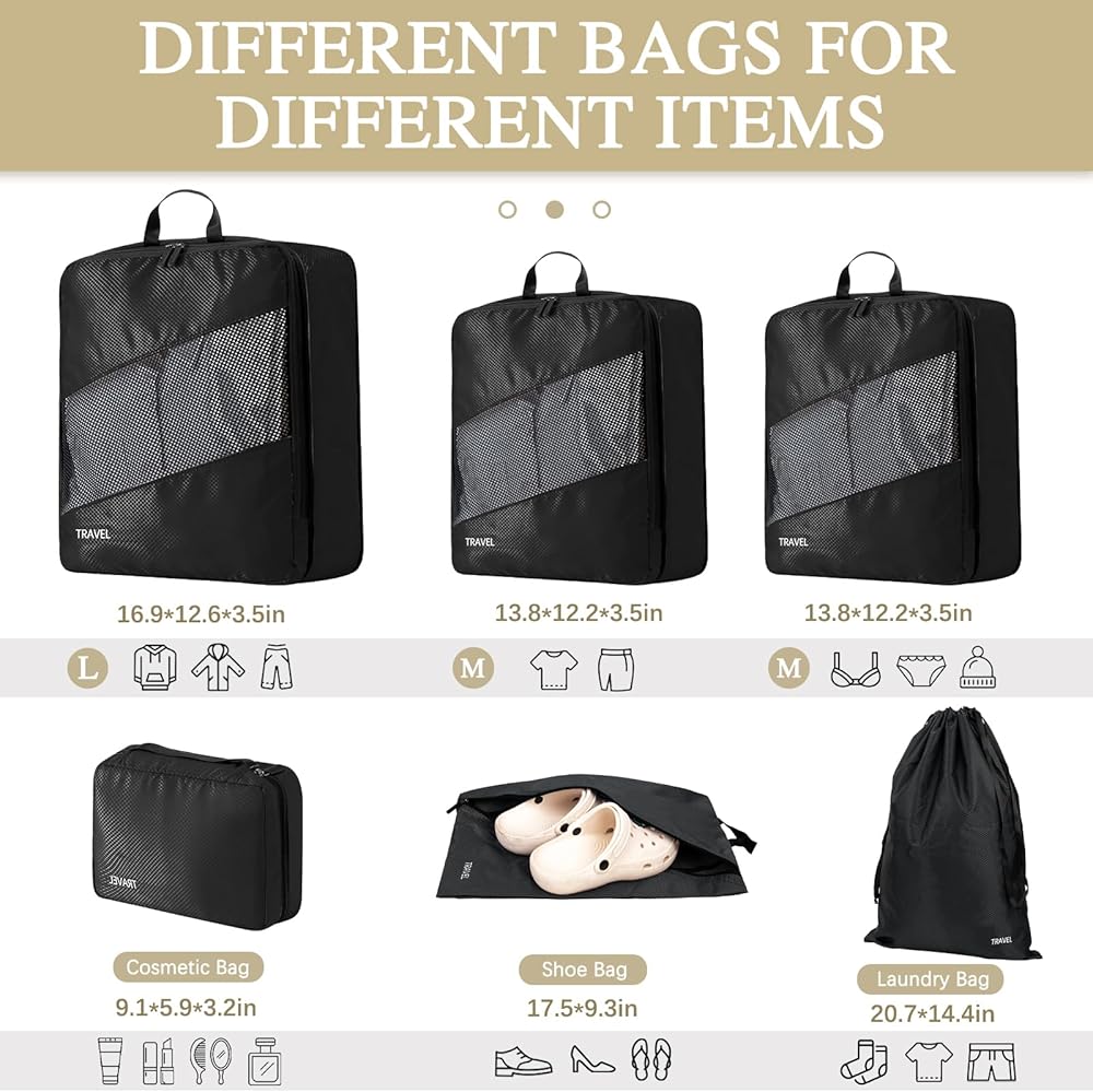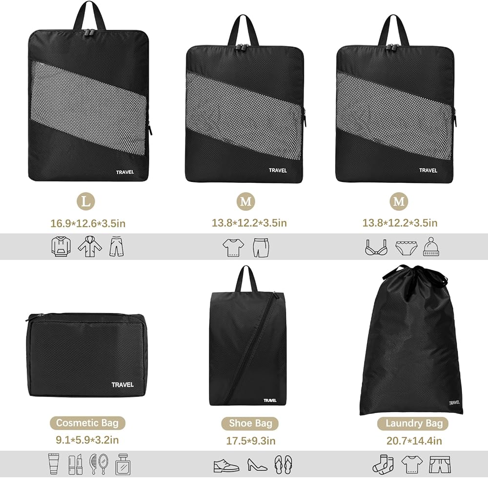 【PERFECT SIZE FOR TRAVEL】Our 6-piece suitcase organizer bags set offers different sizes to categorize clothing, dirty laundry, bras, underwear, shoes, cosmetics, towels, toiletries and electronic accessories. And the overall size is enlarged, so the capacity will be a little bigger, it suitable for most airline luggage, suitcases and backpacks, so you can travel easily.