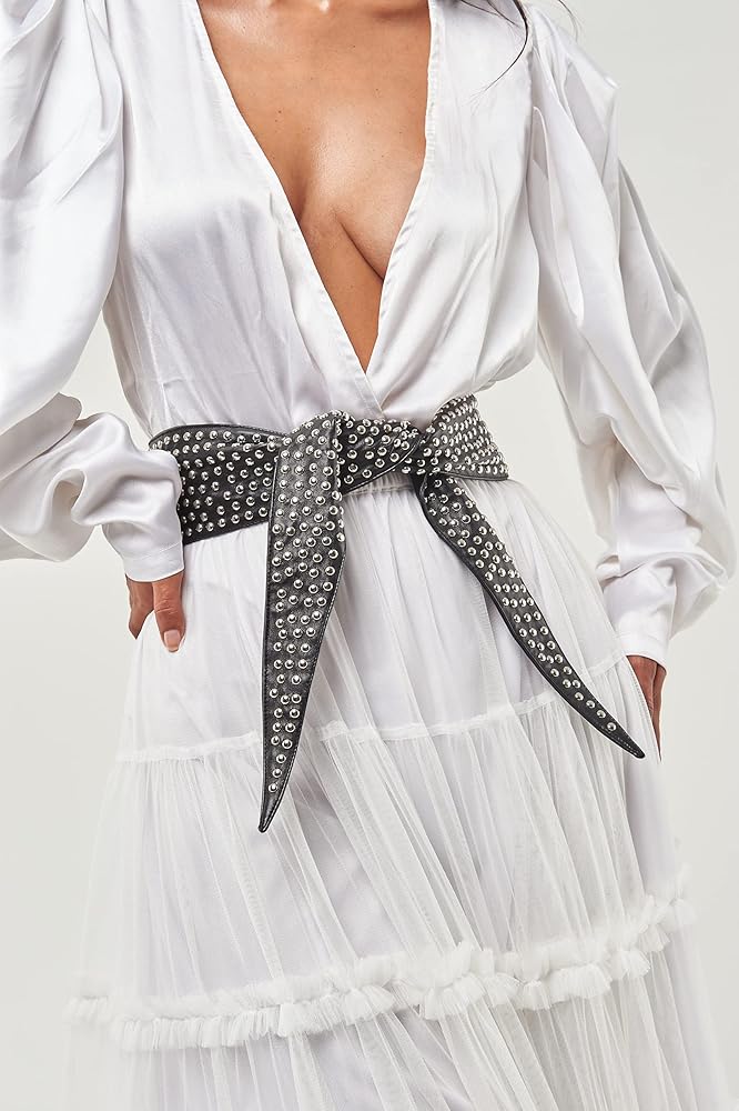 The Knot Stud Belt is a timeless accessory hand crafted in 100% black polyurethane leather, with silver studs that lend a bold touch to its otherwise minimalist design.