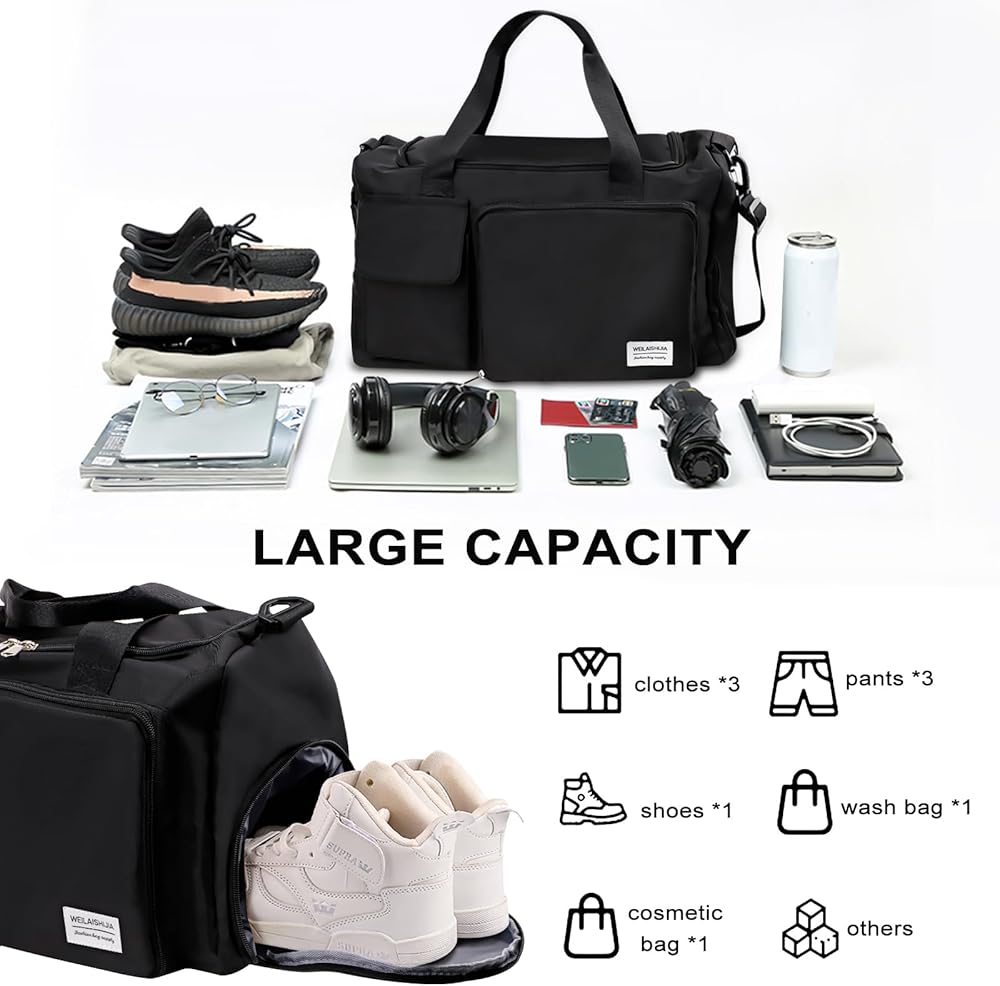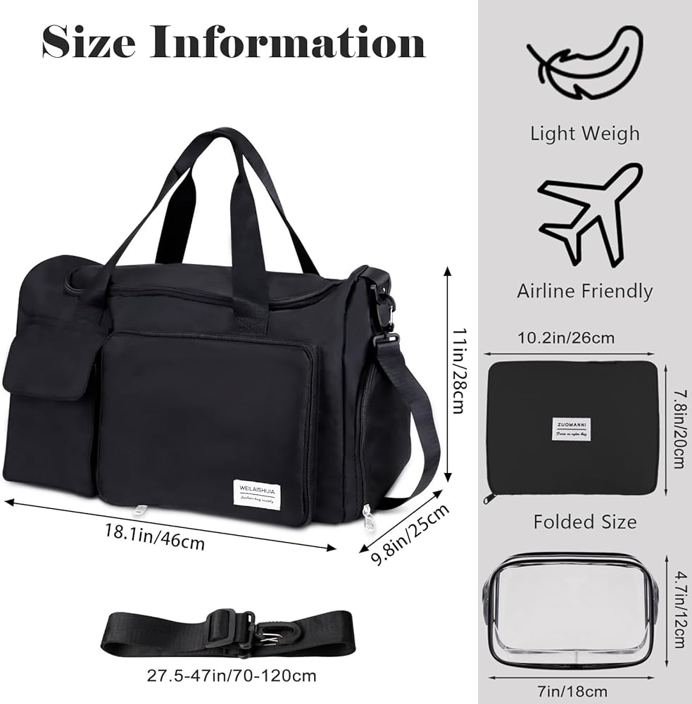 💖【Multi-Compartment & Foldable】-- The Overnight bag measures 18x11x9.8in/46x28x25cm, it has 2 front pockets, 1 back zipper pocket, 1 side pocket, 1 oversized main pocket, 1 isolated wet pocket, 2 internal small pockets and 1 separate shoe compartment. Large capacity can easily meet 3-5 days of short trips. Meanwhile, the folding travel bag can be folded into a compact small bag (10.2*7.8in/26*20cm), it is a good idea to put it in your travel bag as an extra bag.