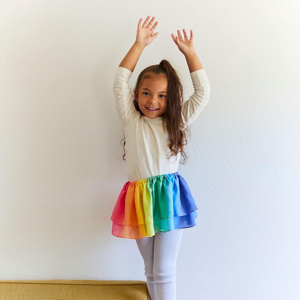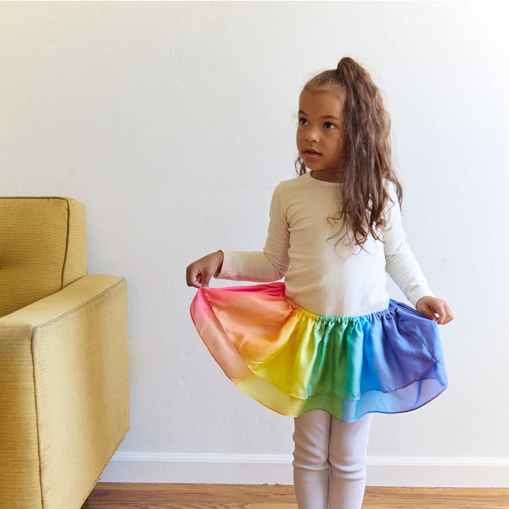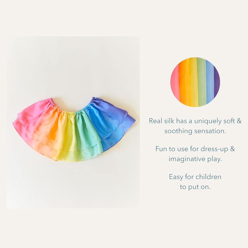 Rainbow Tutus have an elastic waist that stretches comfortably from 20 to 26 inches and are 8 inches in length, sewn with two layers of 100% pure mulberry silk, and hand-painted in our beloved Rainbow colorway.