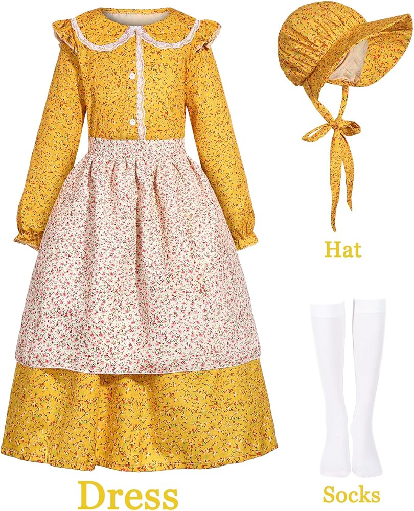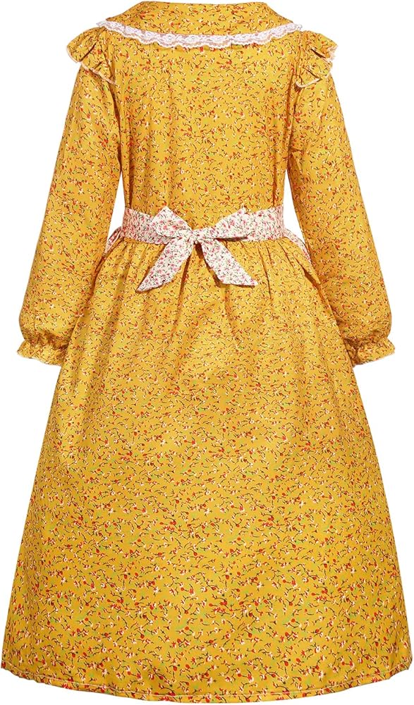 Inspired by the timeless style of the costume of prairie farm maids and colonial girls, this long sleeved pioneer dress features charming floral prints, perfect for girls who love history and retro fashion.