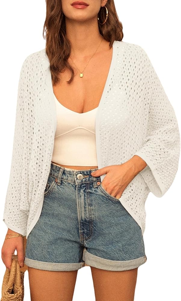 【3/4 Sleeve Batwing Cardigan】Three Quater Batwing Sleeve, Open Front, Drop Shoulder, Trendy Hollow Out, Solid Color, Modest Length, Elegant and Stylish Crochet Knit Cardigan. Oversized Cardigan/Open Front Cardigan for Women/Spring Summer Cardigan Lightweight/3/4 Sleeve Cardigan for Women/Batwing Cardigan/Crochet Boho Cardigan/Knit Kimonos for Women/Summer Outfits.