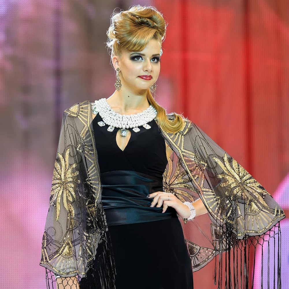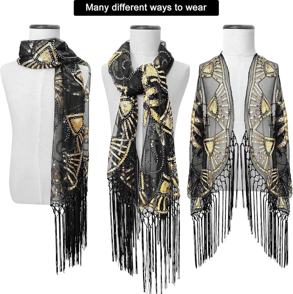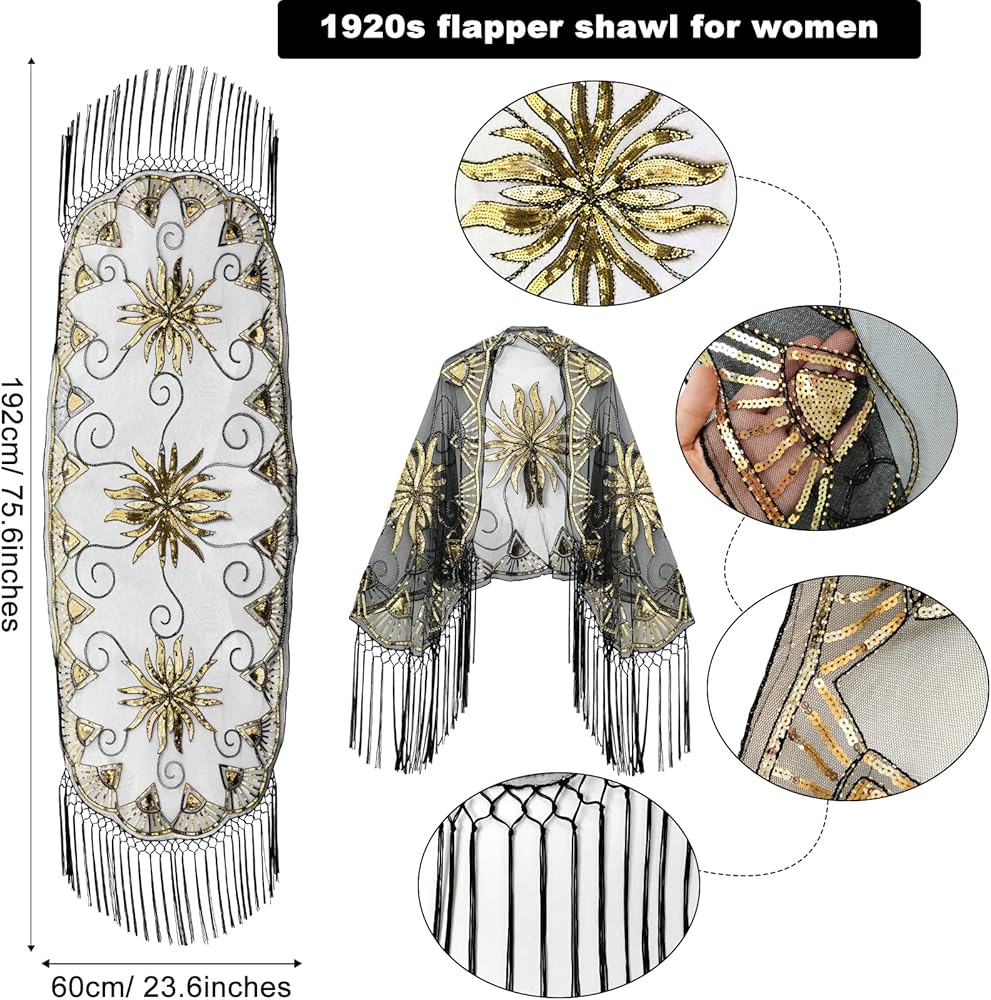 Vintage and Eye-Catching Design: The evening vintage cape design with black chic fringed hem and gold sequins pattern to match, features a sheer look, stunning you to step back in time to the roaring 1920s