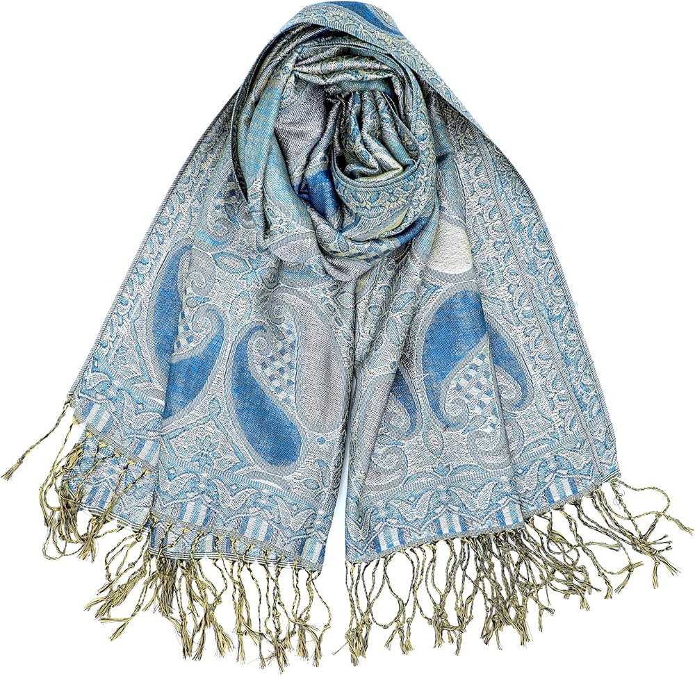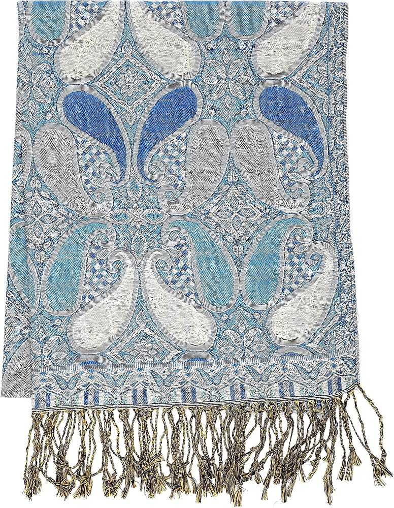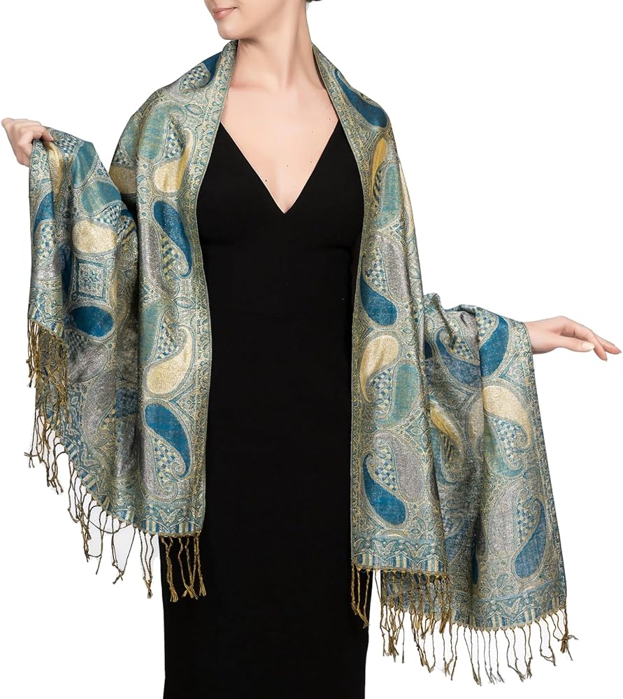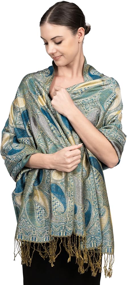 Wear this glittering paisley jacquard pashmina as a wrap for a evening dress, a gown and any other evening outfits. It's a perfect way to accent your favorite wear, and instantly add that extra touch of elegance.