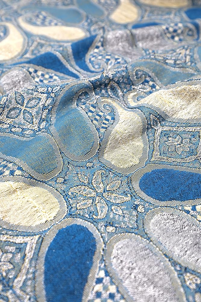Imported. Blend of fine viscose and acrylic. Soft fabric with colorful all paisley design and flecks of metallic thread weave. The sparkle is subtle and classy-looking. Length Approx. 80" with fringes (72" + 4" fringe each side) / width Approx. 27”. Drapes beautifully and colors are vibrant.