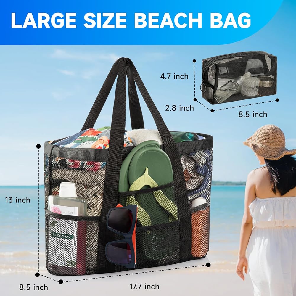 Satisfaction Guaranteed: The package includeds two bags - a large beach bag and an additional mesh makeup bag to securely hold your items. We strive to provide the best customer experience. If you have any issues with our beach bag, please feel free to contact us. We offer a 100% satisfaction guarantee.