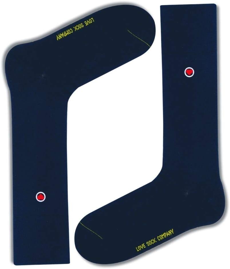 Premium organic cotton mid calf Navy dress socks with love sock company heart embroidery. Super soft, moisture wicking and highly breathable. Knitted with 200 needle machines, seamless toes. 98% Organic Cotton, 2% Elastane. One size fits most US Men shoe size 7-12. Designed in USA, made in Europe.