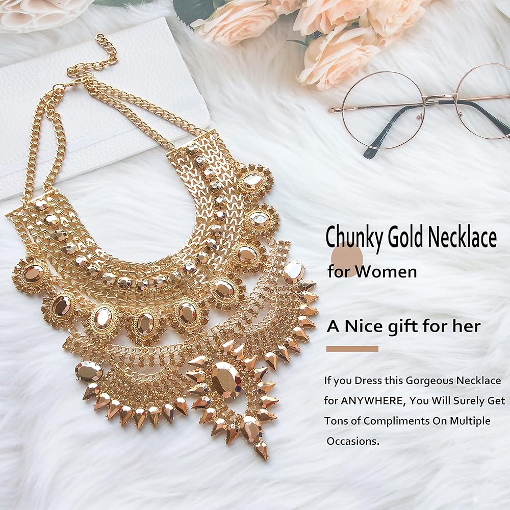 Black gold statement necklace made by gold alloy, sparkly crystals and jet-black gems, the workmanship is exquisite and have good color retention, not easy to fade. Please avoid long-term water immersion and wind blowing in the sun.