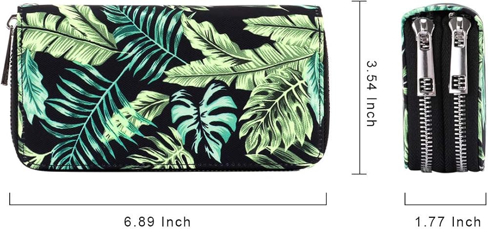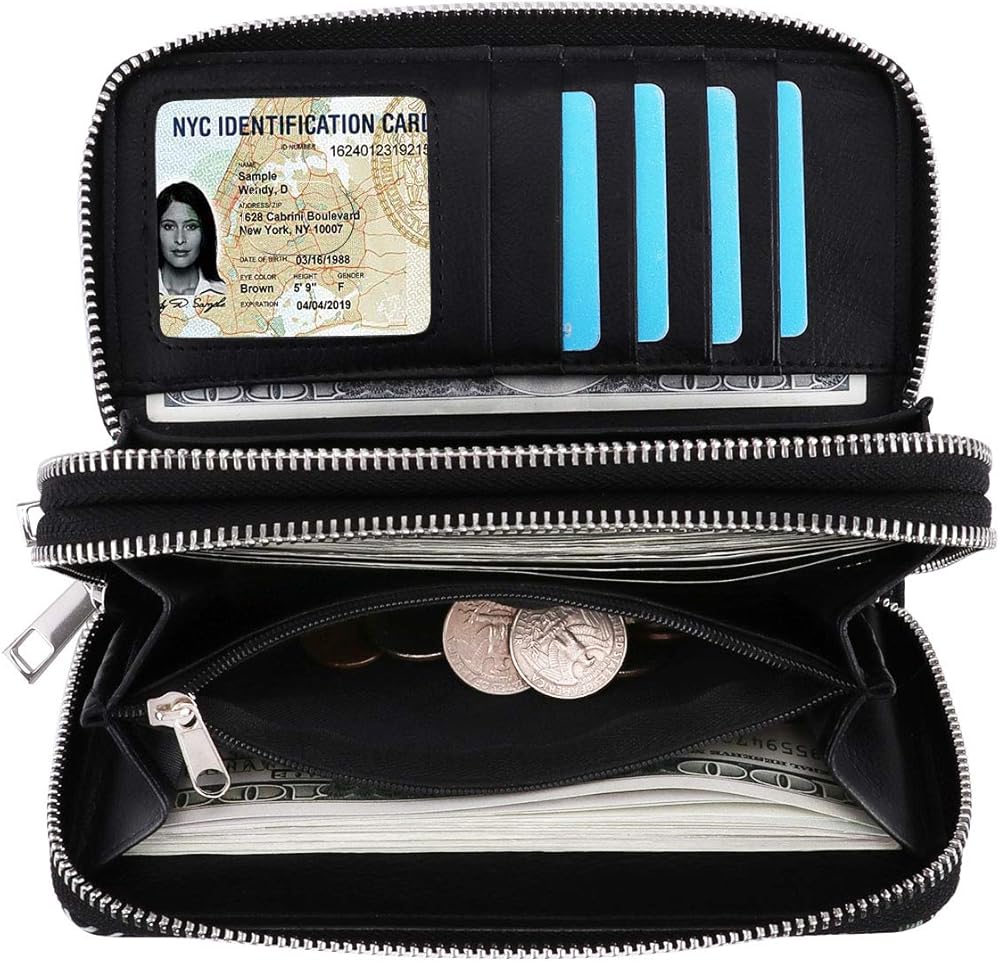 5 card slots(including 1 clear ID windows), 2 full-length bill compartments,1 zippered coin pocket and 1 cellphone slot; keep your credit cards, cash, coins, notes, receipts, checkbook and your cell phone well organized.