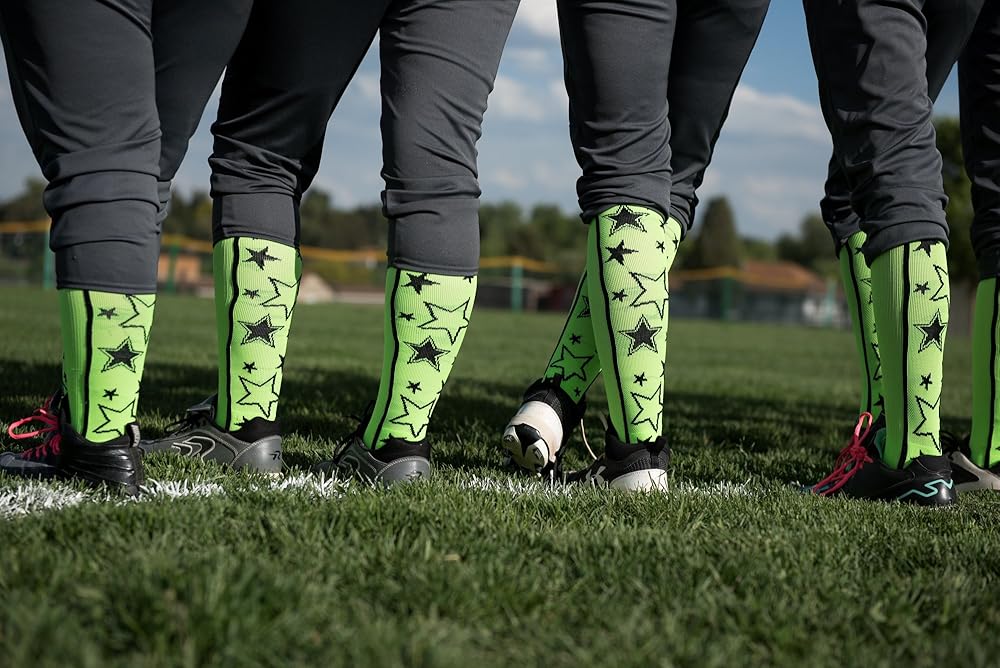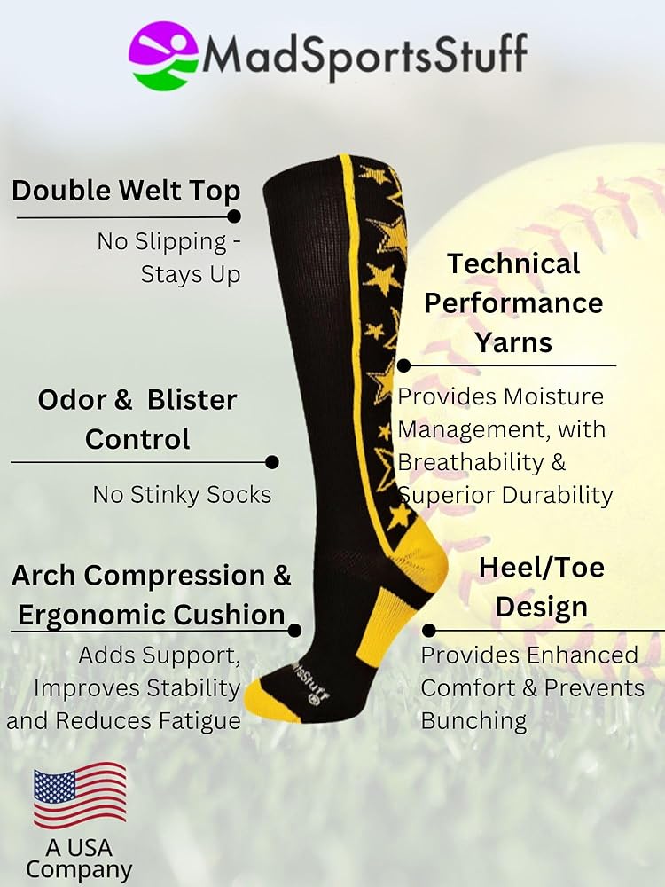 PERFECT SPORTS SOCKS: Stand out on the field or court in these super fun socks with stars. Ideal for softball, baseball, lacrosse, basketball, field hockey, volleyball, wrestling, soccer, football, cheer, kickball and more!