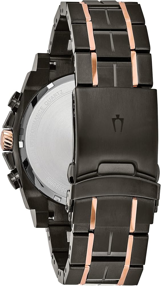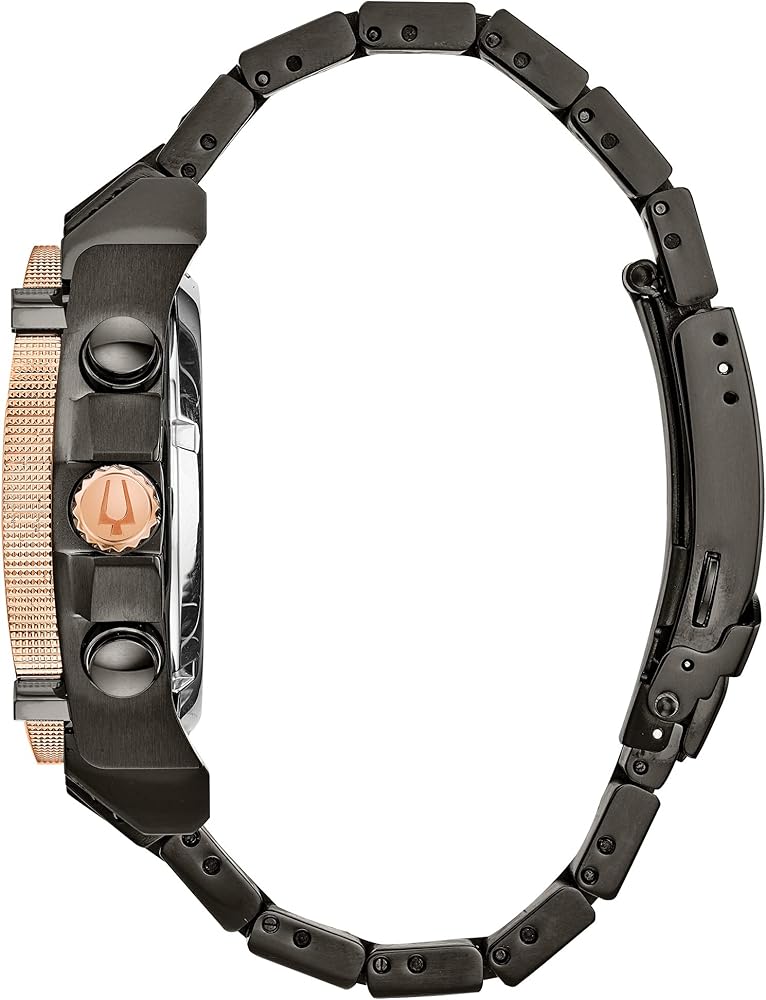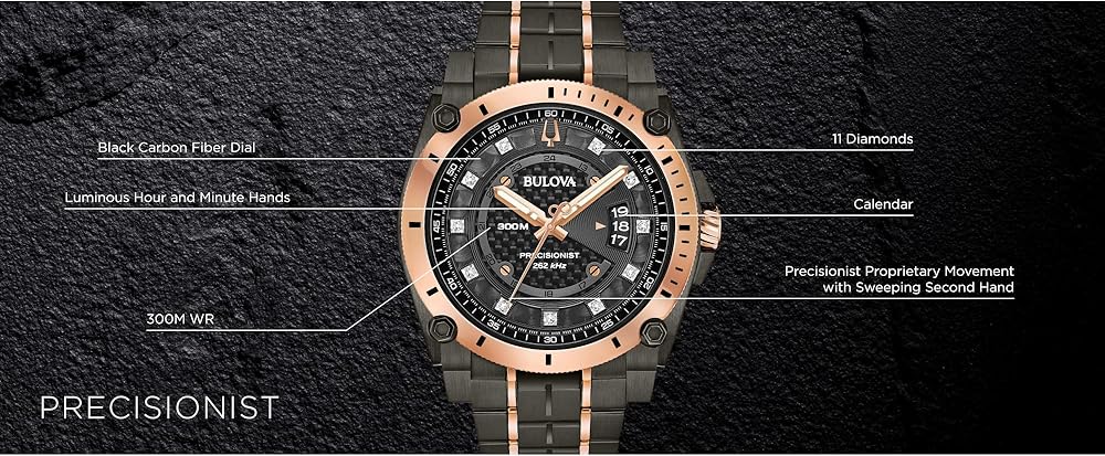 Be punctual in style with this bold and handsome watch from Bulova's Precisionist Collection. The Precisionist Collection features watches that use a super-high frequency to keep accurate time to 1/1000th of a second. Bulova's exclusive quartz crystal Precisionist three-hand calendar movement uses a 262 kHz vibrational frequency, which is eight times greater than those used in standard timepieces. The watch's patterned black and grey dial boasts 11 diamonds as hour markers, as well as the Precisionist line's hallmark: the continuously sweeping second hand. The multi-level carbon fiber dial also showcases a date window and luminous hands. Also featured is a screw-back case, curved crystal, a screw-down crown, and a water resistance of 300 meters. Completing the look is gold-tone stainless steel bracelet that comfortably secures with sport fold-over buckle closure. Features: 46.5mm gold-tone stainless steel screwback case, Quartz crystal Precisionist three-hand calendar movement with a 262 kHz vibrational frequency, Black multi-level carbon fiber dial with luminous hands, 11 diamond hour markers, Date window, Sweeping second hand, Curved mineral crystal, Screw-down crown, 300 meter water resistance, Gold-tone stainless steel bracelet with sport fold-over buckle closure, Bulova Style #: 98D156
