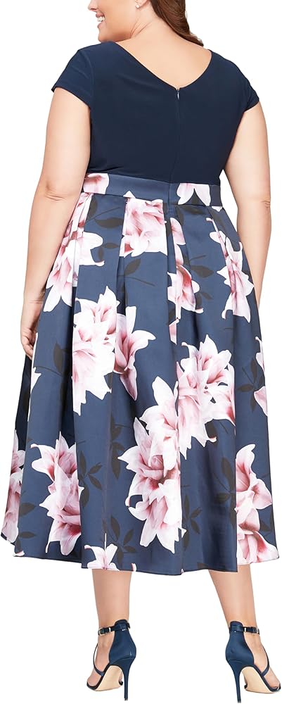 - Stretch Jersey Sleeve Bodice with Allover Floral Printed Mikado Pleated Skirt