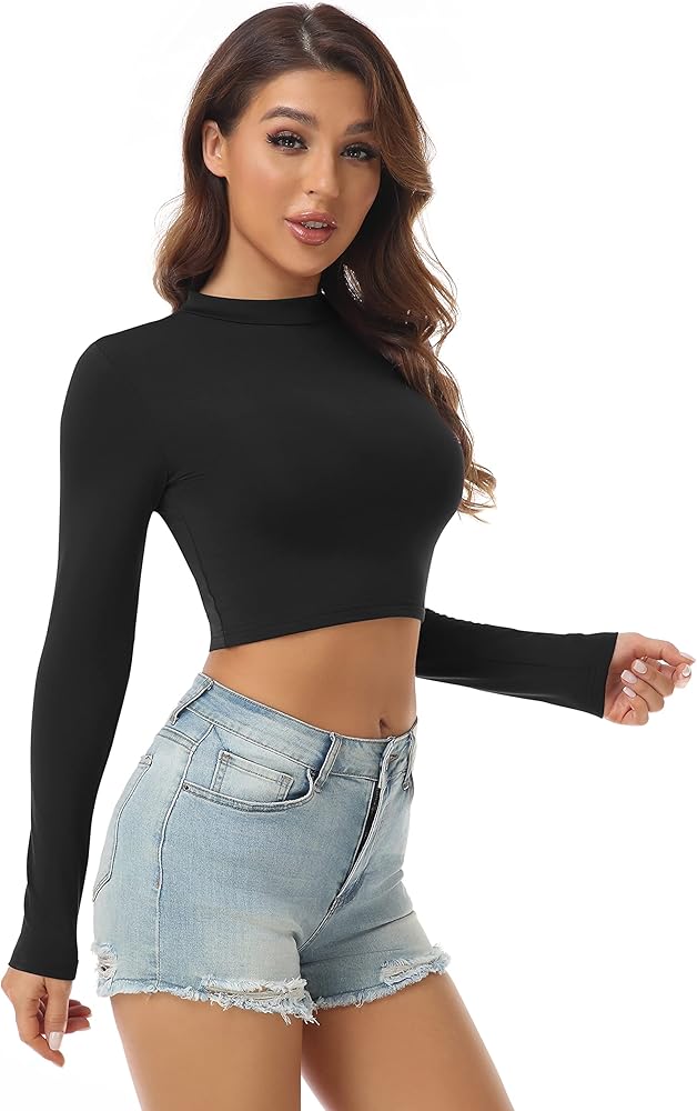 AUHEGN Women's Crop Topss Mock Turtleneck Long Sleeve Lightweight Base Layer Shirts