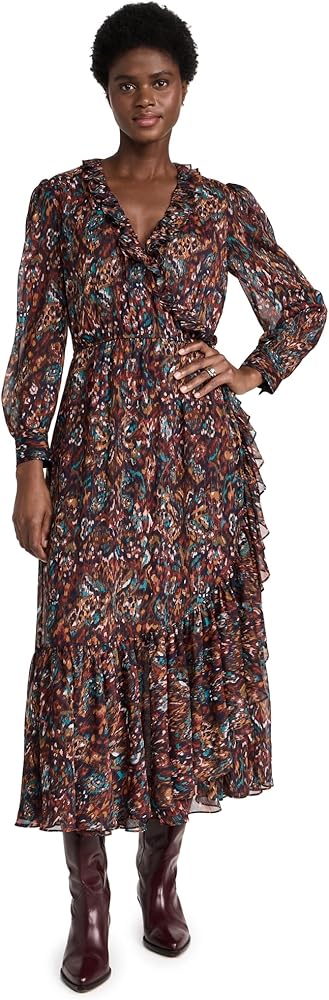 Faux wrap silhouette and surplice neckline, Long puff sleeves with button cuffs, Ikat print with stripe metallic threading, Covered elastic waistband, Ruffle trim