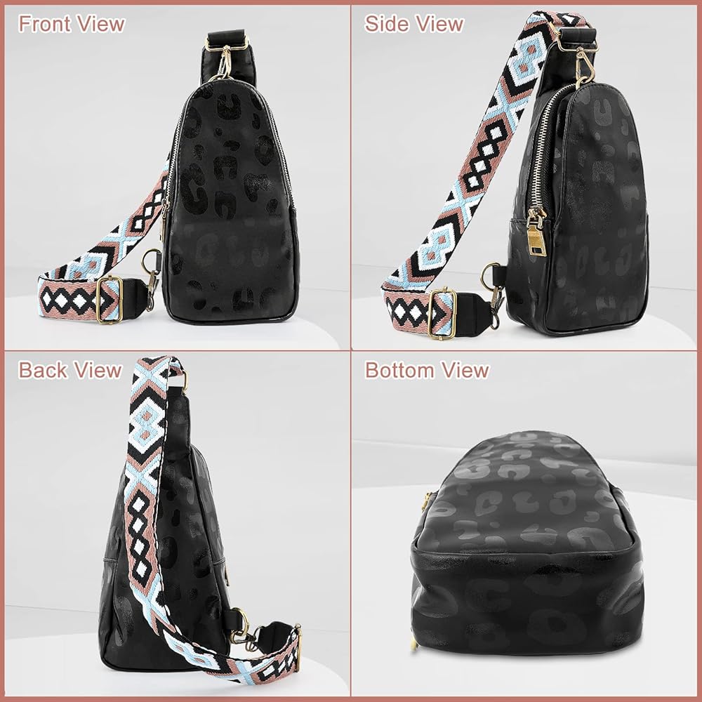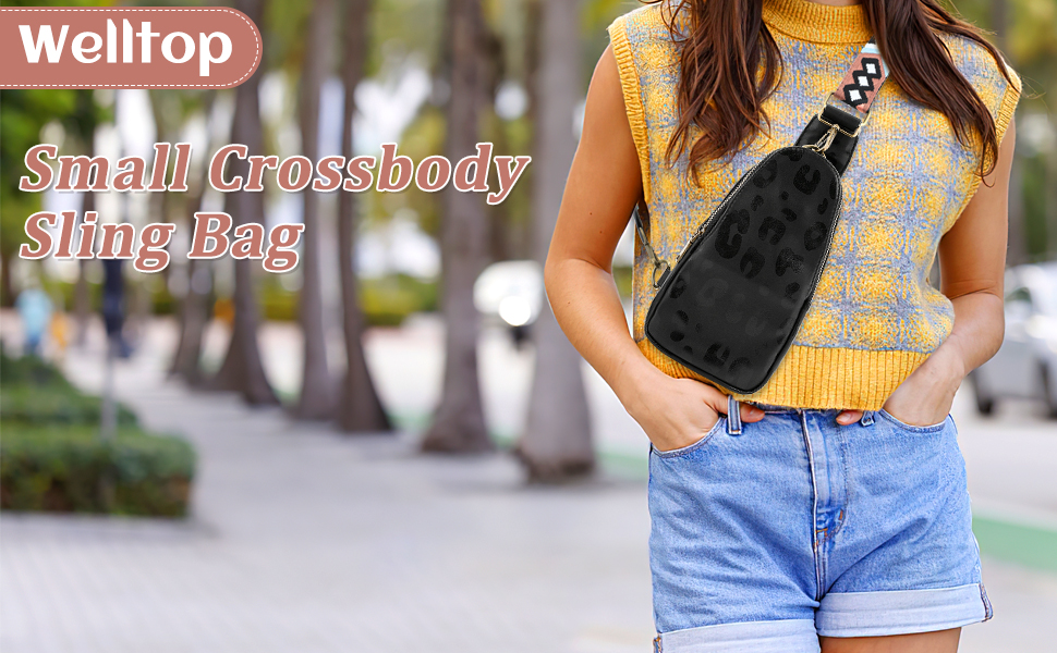 Welltop Sling Bag for Women, PU Leather Chest Bag Small Crossbody Casual Daypack Fanny Packs with Adjustable Guitar Strap Fashion Shoulder Backpack Purse for Women Men Daily Traveling Use