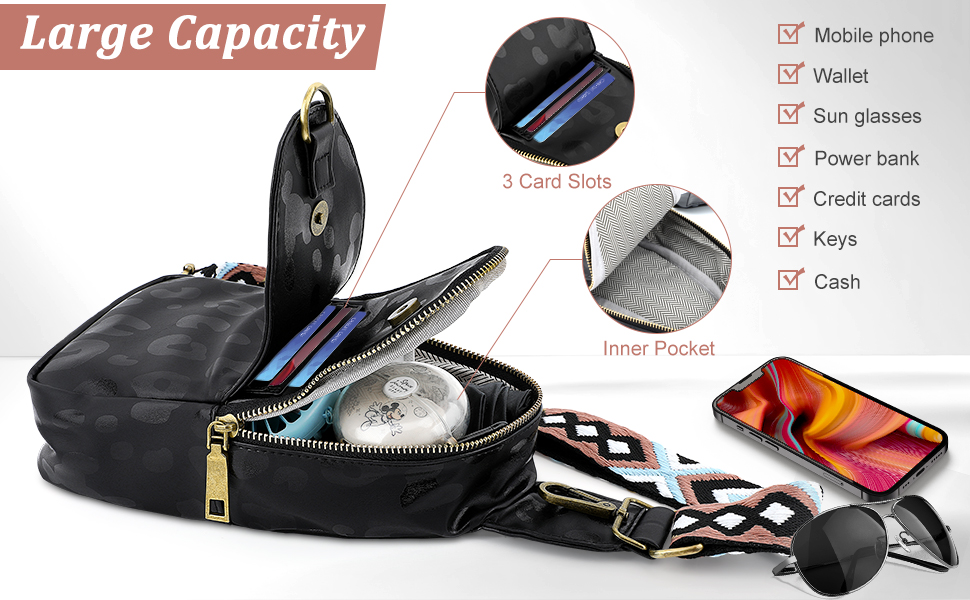 【Multi-functional Chest Bag】--- Size: 25 x 14 x 7cm/9.8 x 5.5 x 2.8in. The black leather sling bag has one zip pocket, one pocket with magnetic buckle and three card slots, enough space to store phone, wallet, sun glasses, power bank, credit cards, driver license, keys, cash and other small items, meet your daily use.