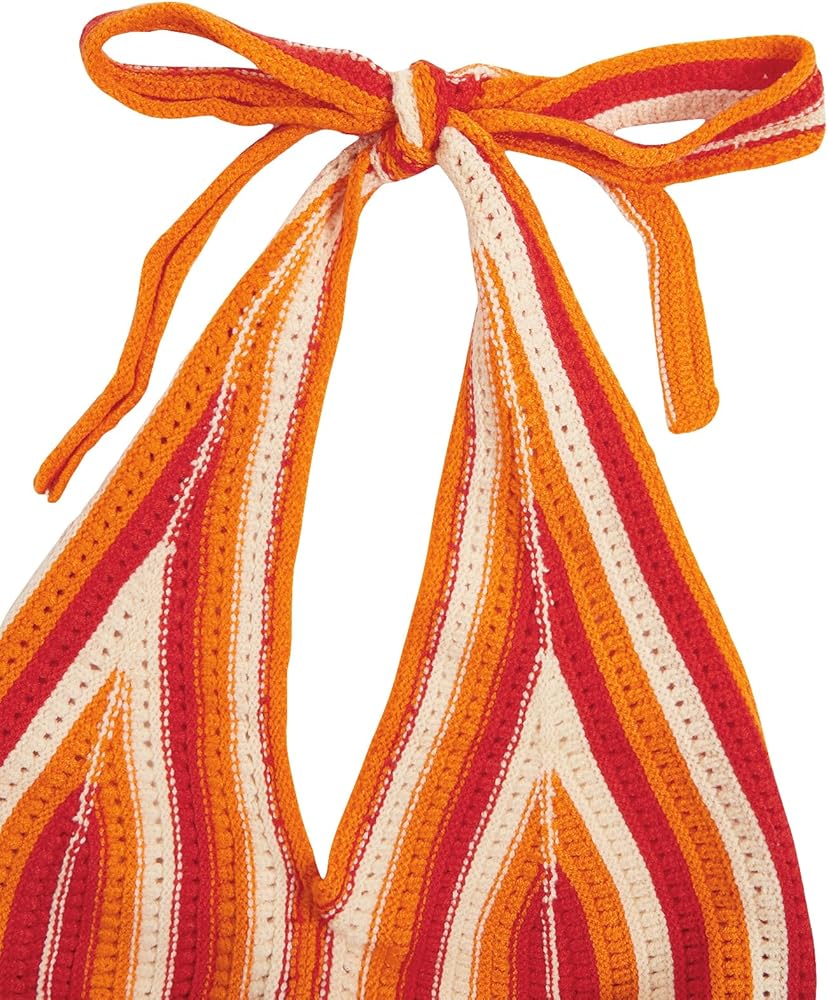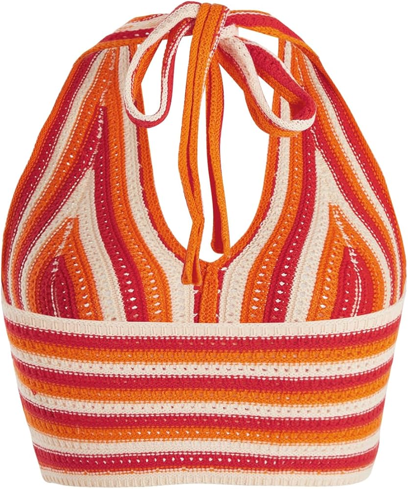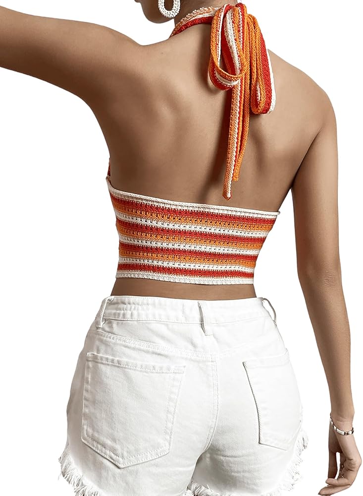 Verdusa Women's Colorblock Striped Crop Halter Top Tie Backless V Neck Going Out Tops Summer Vacation Outfits